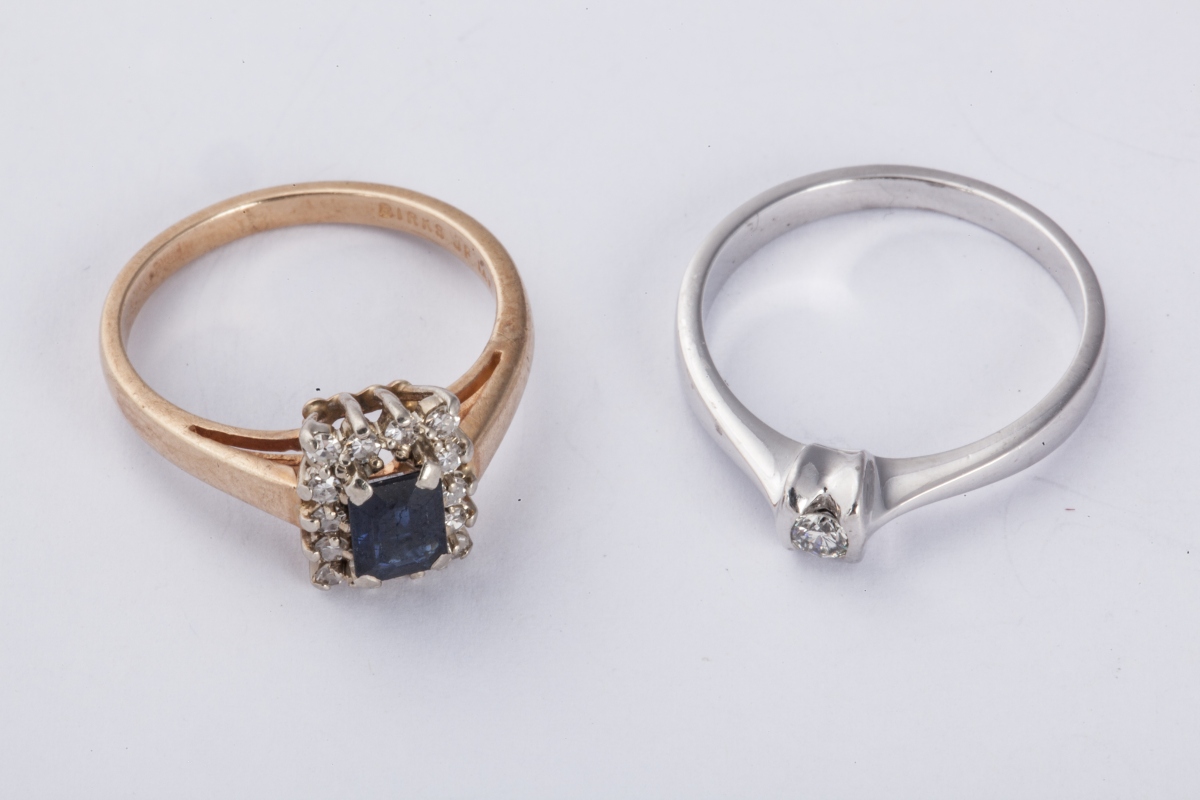 Lot de DEUX BAGUES en or jaune 585 millièmes (14K) ou or gris, serties d'un saphir et de petits diamants de taille brillant ou huit-huit.