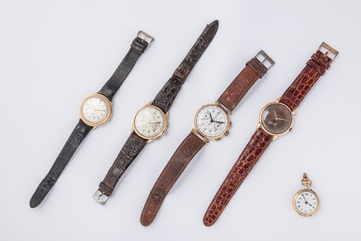 Lot comprenant QUATRE MONTRES bracelets d'homme, les montres de forme ronde en or jaune, les tours de poignet en cuir, et une montre de col à remontoir au pendant en or.