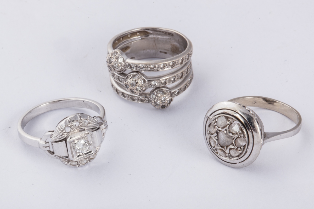 Lot de TROIS BAGUES en or gris, serties de diamants et pierres de synthèse.