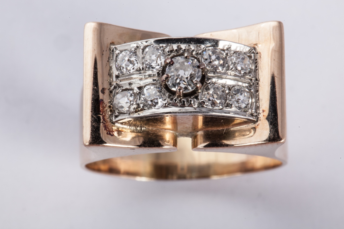 BAGUE genre chevalière, sertie d'un diamant central de taille ancienne entre huit diamants plus petits.