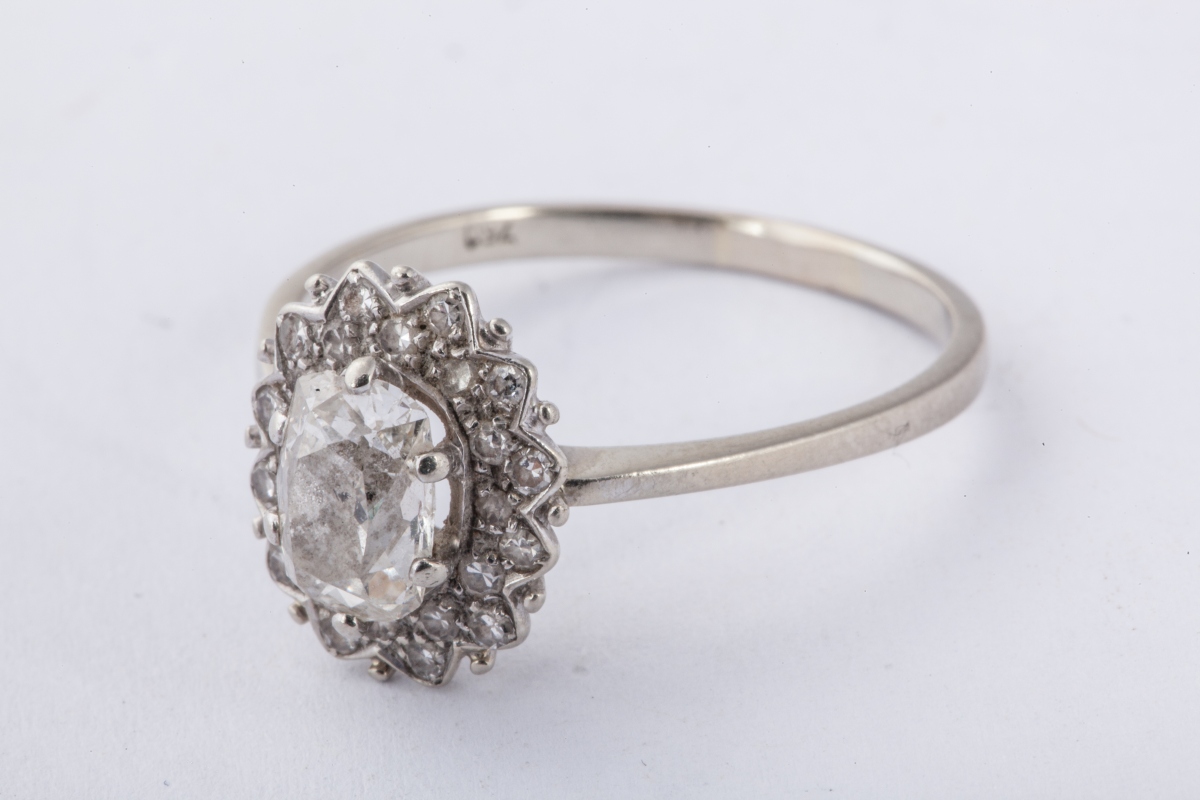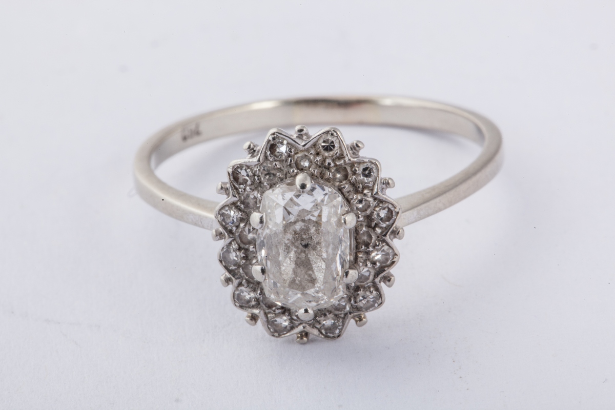 BAGUE en or sertie d'un diamant central de taille ancienne et de forme coussin, dans un entourage de petits diamants taillés en huit-huit.