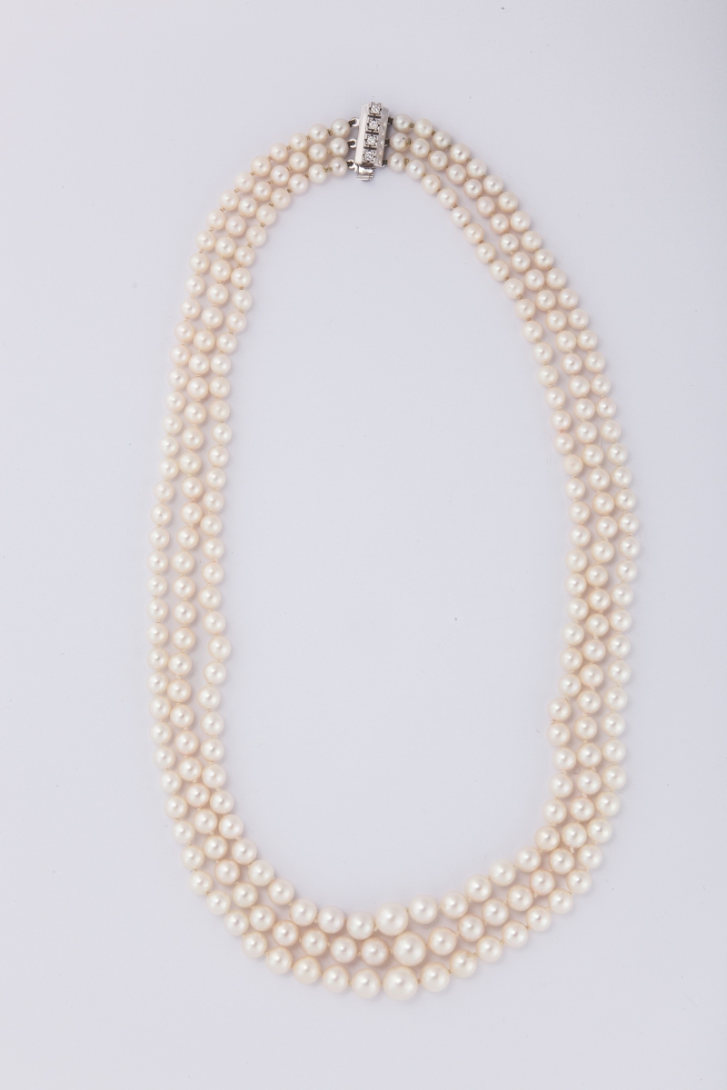 COLLIER trois rangs de soixante-quinze, soixante-dix neuf et quatre-vingt six perles de culture en chute, le fermoir en or gris serti de quatre diamants ronds de taille brillant.