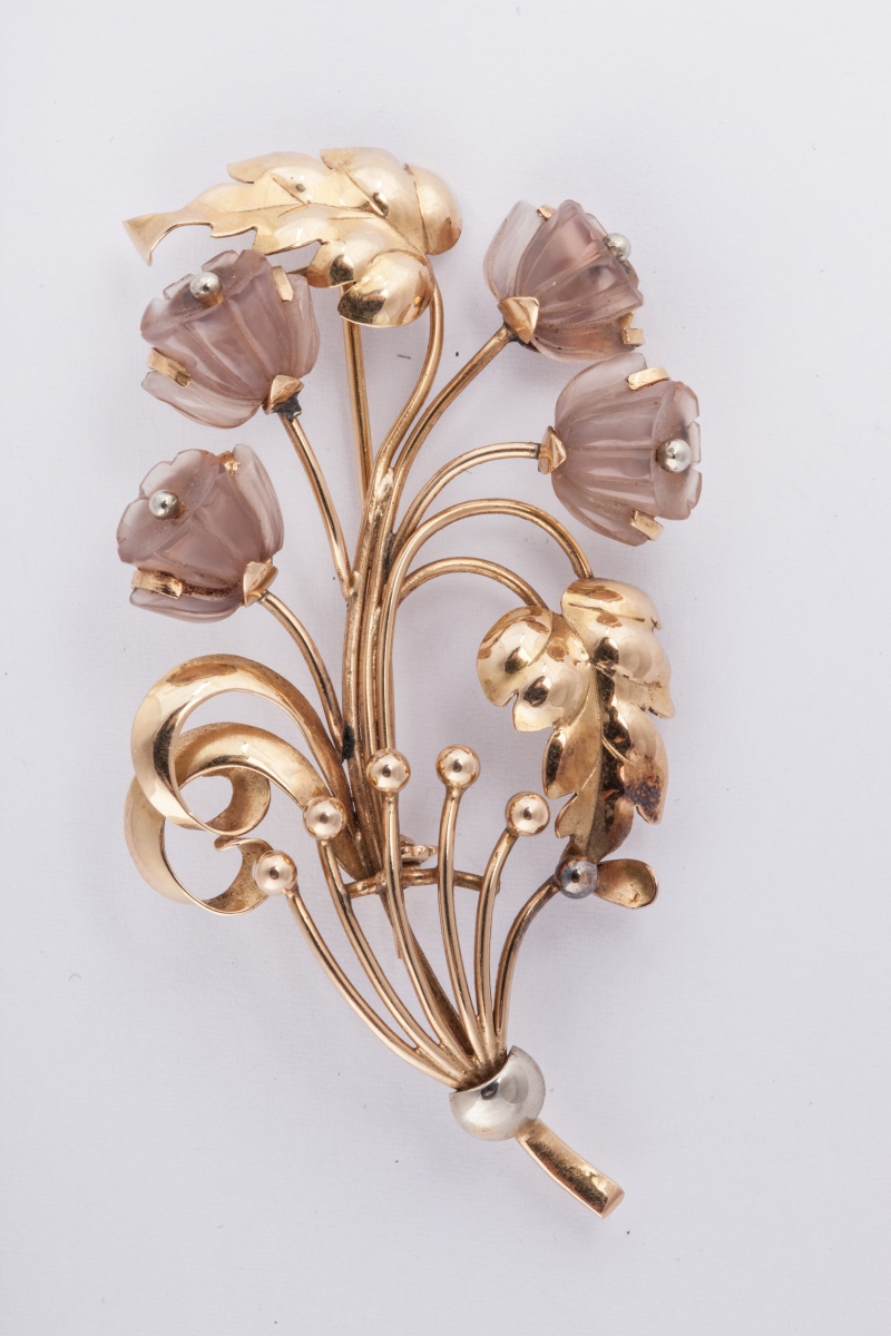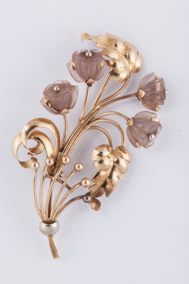BROCHE fleurs en or jaune, partiellement sertie de quartz rose gravé.
