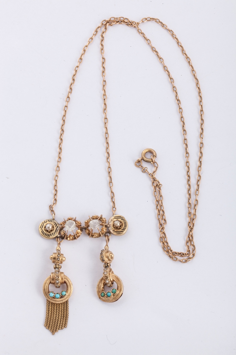 COLLIER en or orné d'une barette avec 2 pierres blanches, retenant 2 pendentis rehaussés de turquoises. Poids brut 11,7 g.