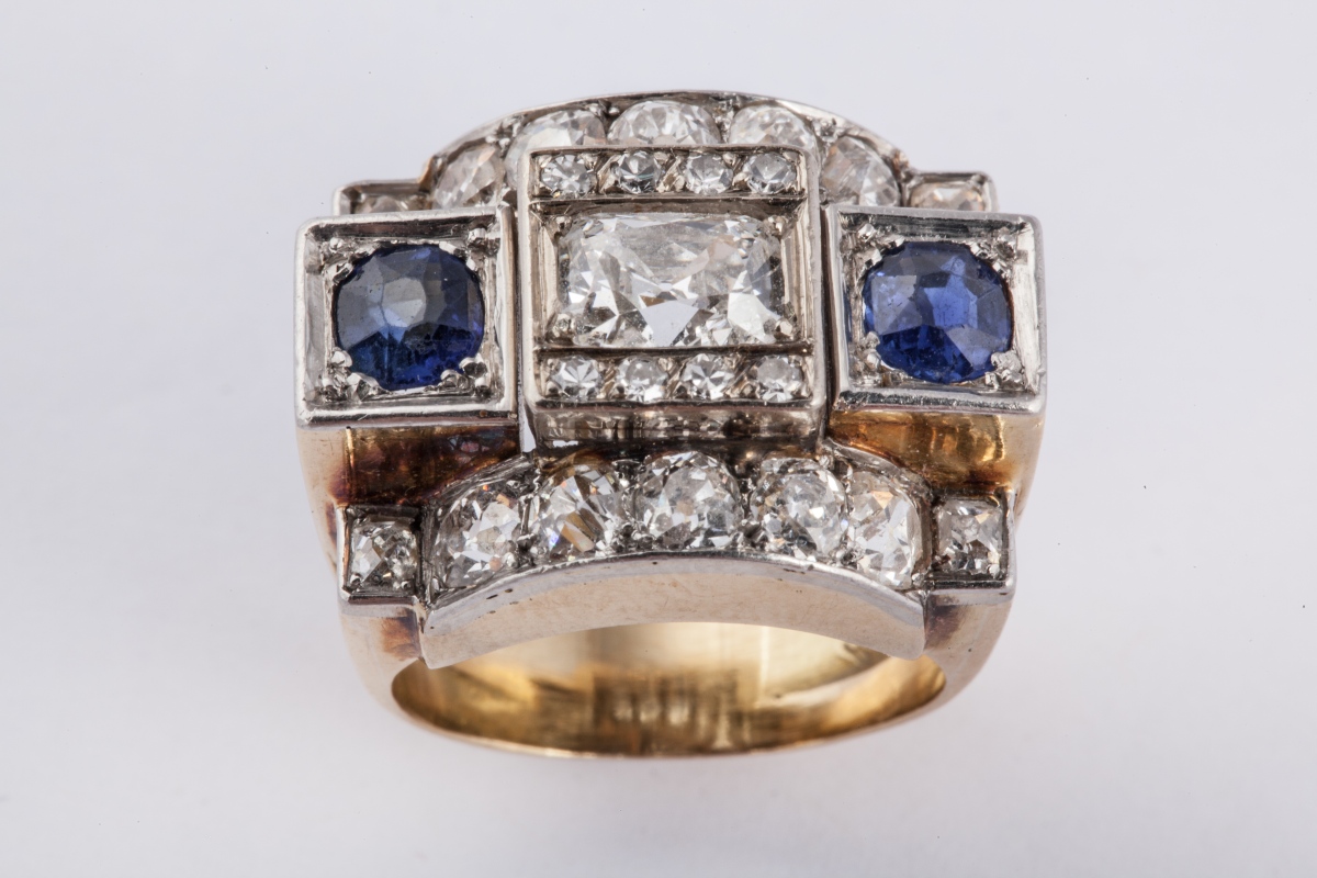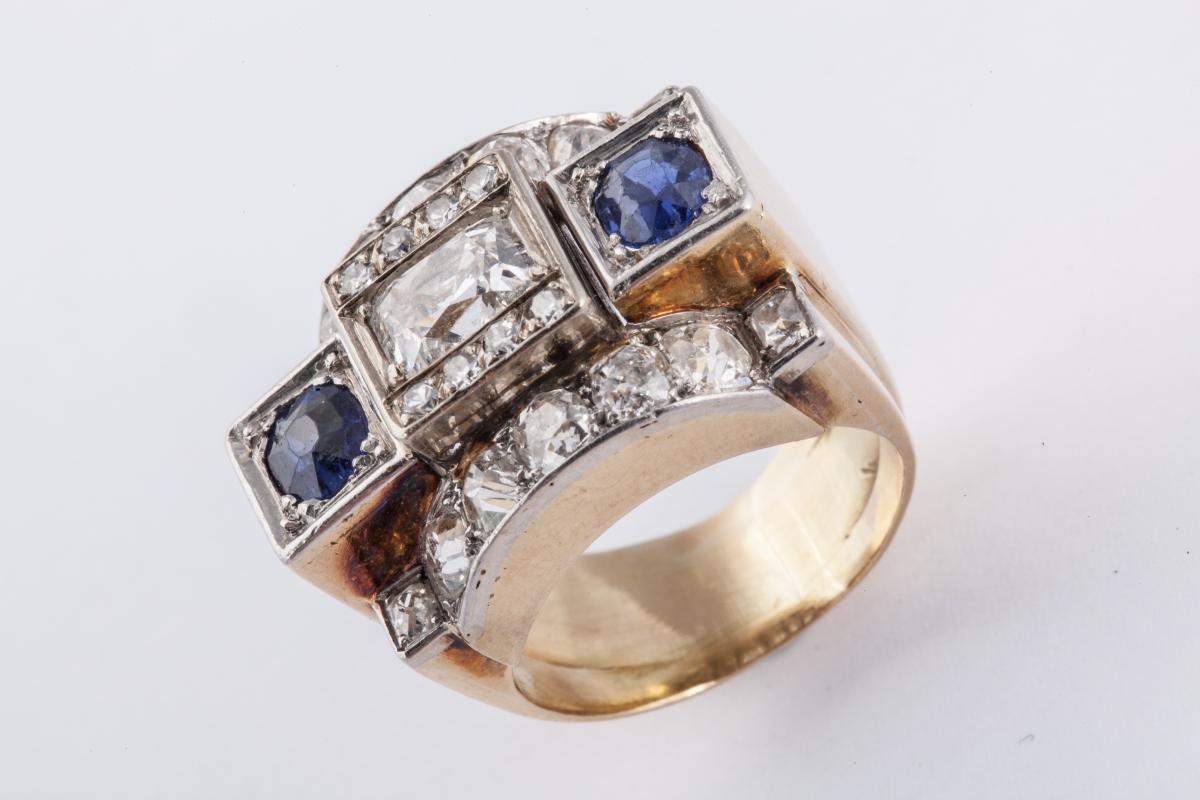 BAGUE en or, de forme géométrique, ornée d'un diamant coussin de taille ancienne, entre quatre lignes de diamants ronds et deux saphirs.