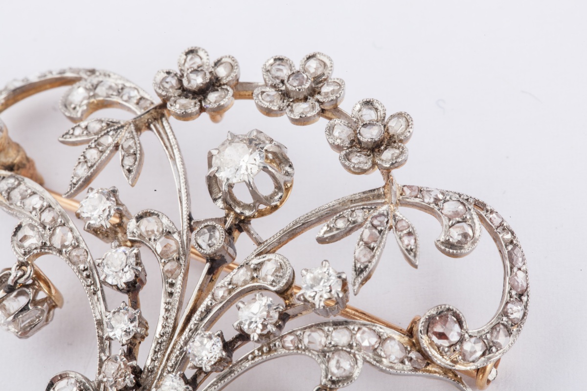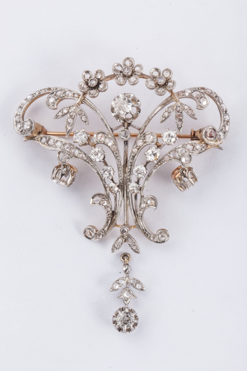 BROCHE volute à décor de fleurs, pouvant former pendentif, en or ajouré, entièrement sertie de diamants ronds de taille ancienne et taillés en rose, dont trois en pampille.