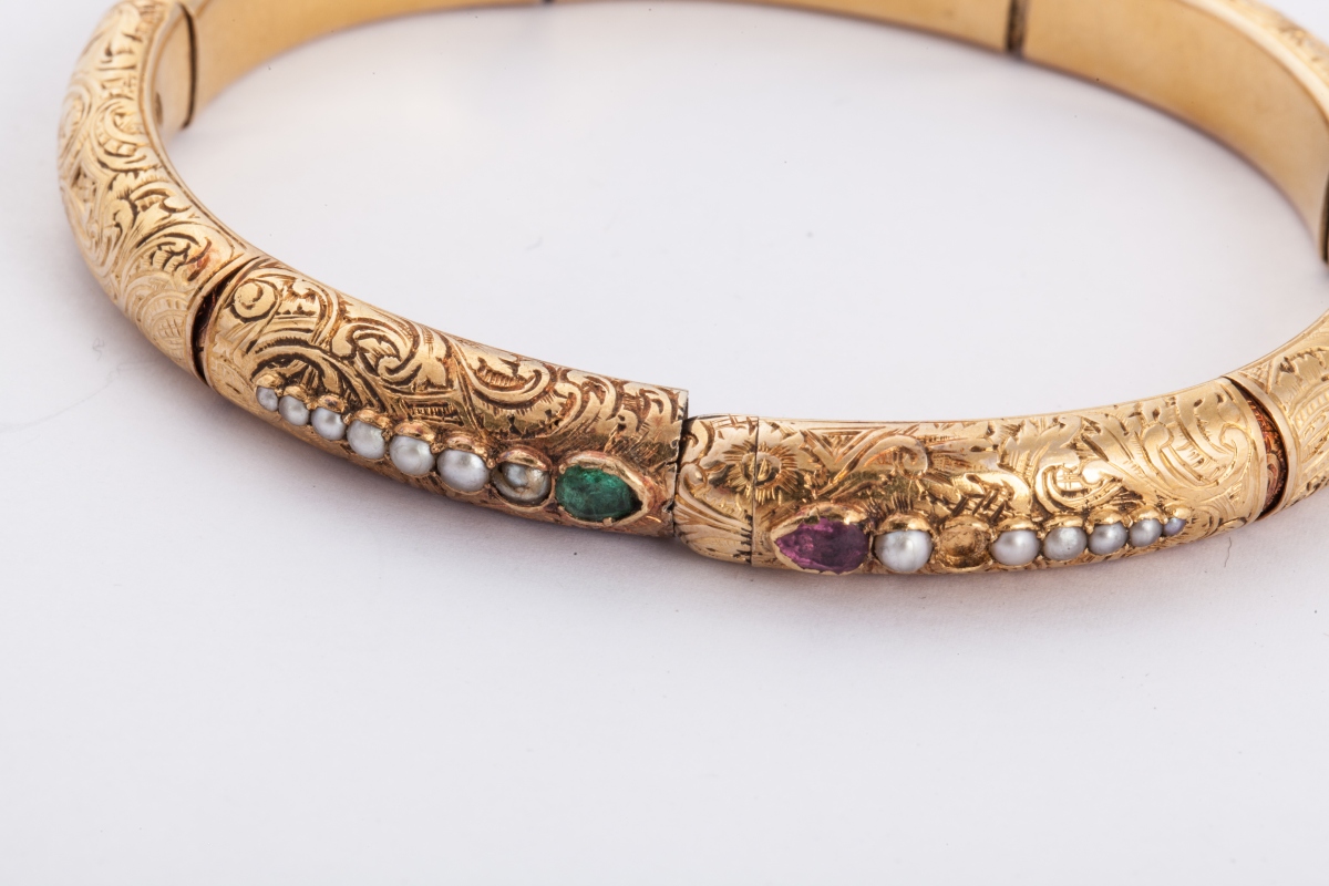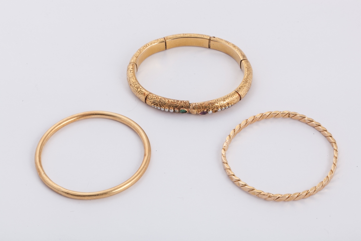 3 BRACELETS en or. 2 bracelets rigides, l'un torsadé, l'autre jonc. Le troisème, ciselé d'arabesques, est articulé et s'ouvre. Les extrémités sont serties d'une pierre verte et rose finissant par une ligne de perles de tailles décroissantes.