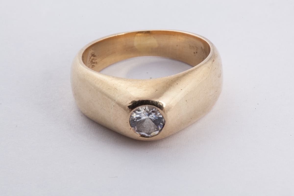 BAGUE JONC en or jaune, ornée en son centre d'une pierre blanche en sertis clos.