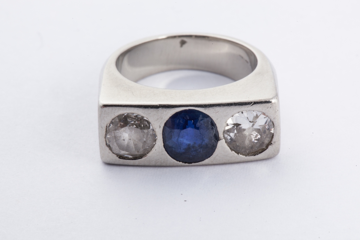 BAGUE JONC en or gris, ornée en son centre d'une pierre bleue encadrée de deux pierres blanches en serti clos.