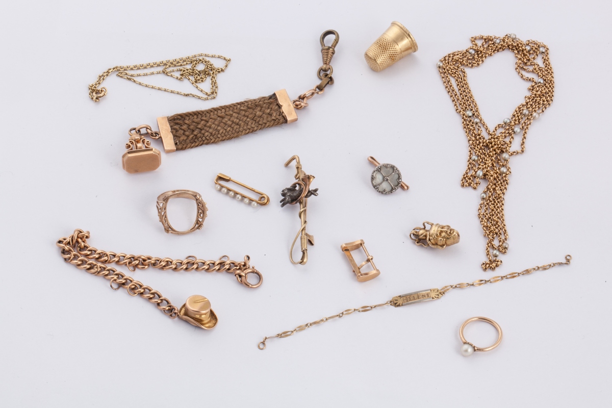 Joint un LOT d'OR à la CASSE : un bouton de manchette orné de pierres blanches sur fond de nacre, un dé, une attache de montre, une gourmette soutenant un chapeau en pendentif, une monture de bague pour Louis.