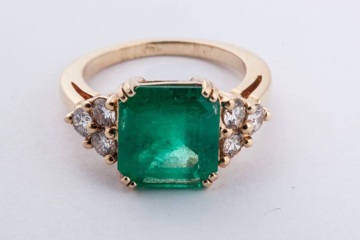 BAGUE en or jaune sertie d'une émeraude d'environ 4,8 carats épaulée de six petits diamants d'un poids total de 0,60 carat environ. Poinçon tête d'aigle.