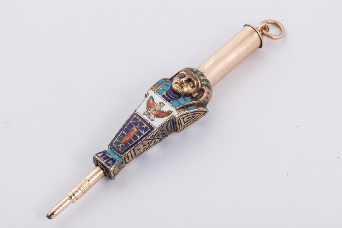 PORTE-MINE rétractable en or. Sarcophage égyptien en émaux cloisonnés, bleu, rouge, blanc et vert. Anneau en pendentif.