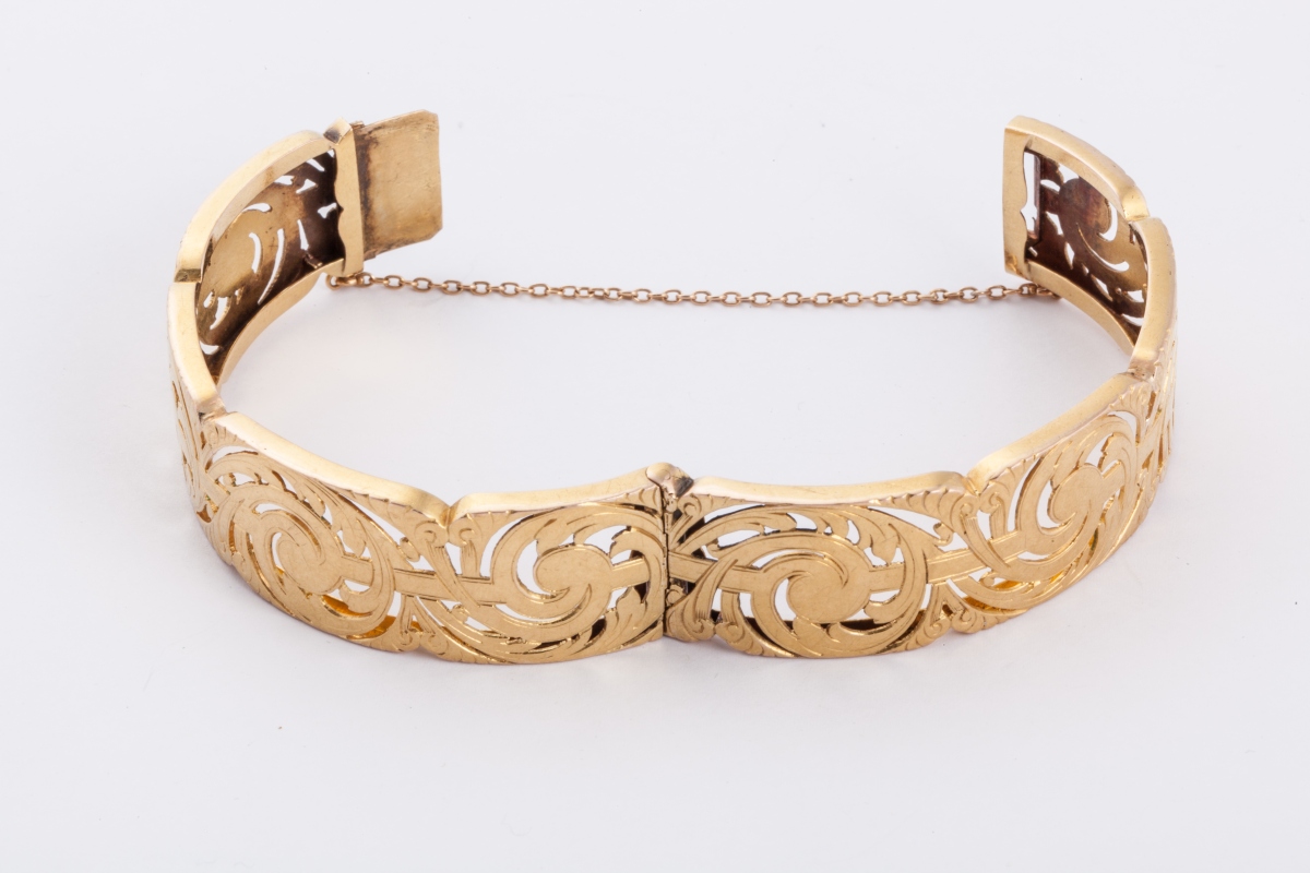 BRACELET RIGIDE articulé en or jaune repercé d'arabesques.