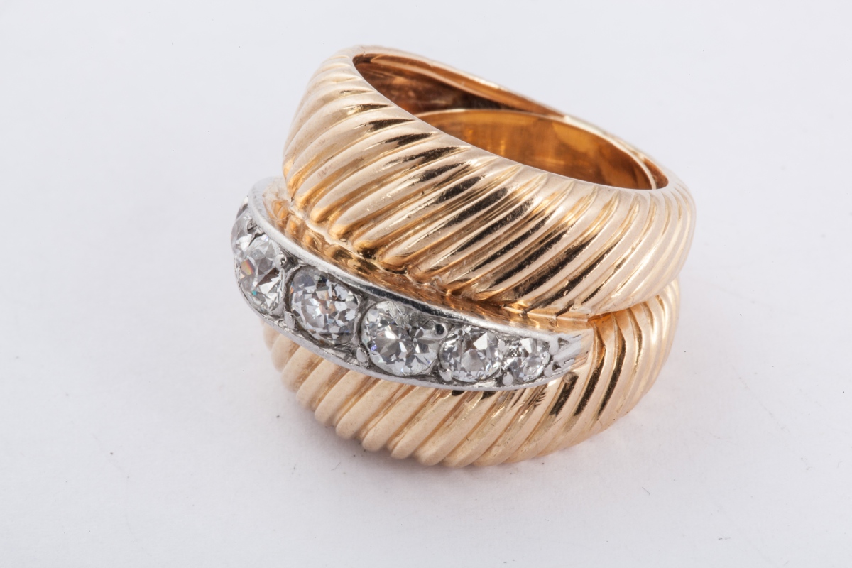 BAGUE deux-corps en or jaune décoré de cannelures, ornée, au centre, d'une ligne de diamants de taille ancienne en chute. Poids brut : 11 g. Tour de doigt : 48.
