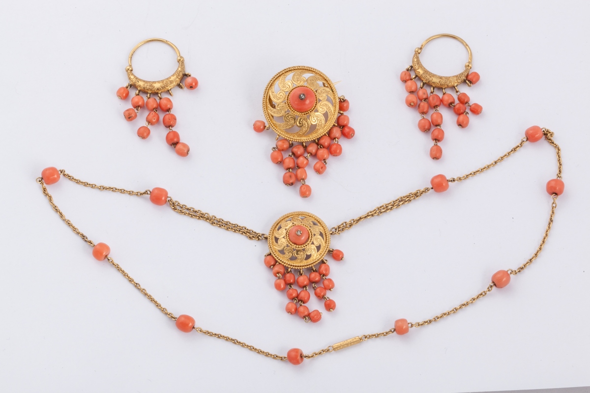 PARURE en or jaune, ornée de boules de corail, comprenant un collier draperie, une broche et une paire de boucles d'oreilles.