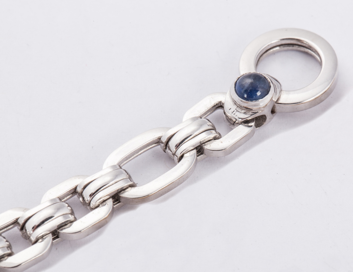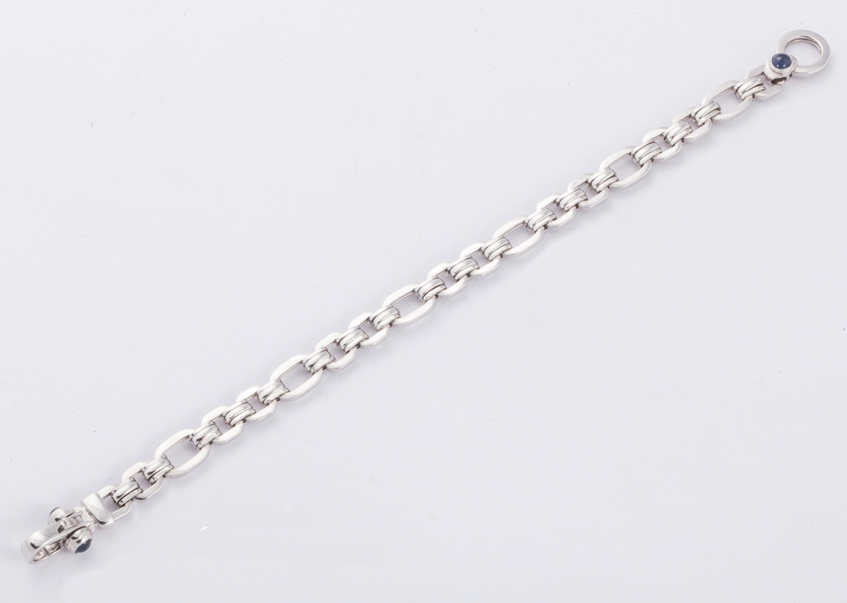 GOURMETTE en or blanc, mailles cannées, le fermoir serti de deux saphirs en cabochon. Poids brut : 13,1 g.