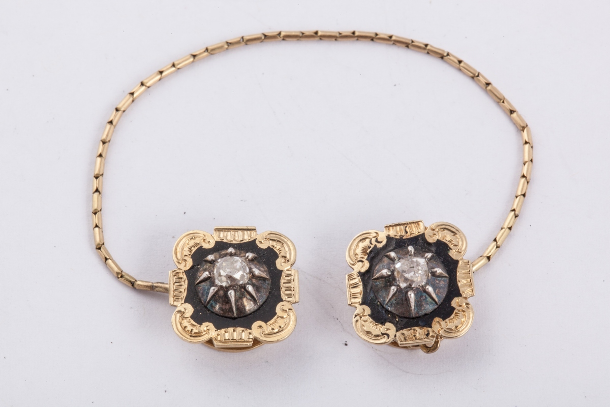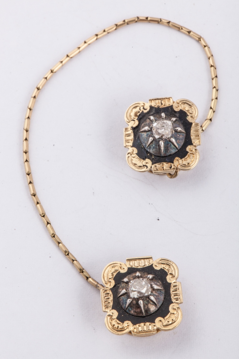 2 BOUTONS en or, se présentant sous la forme de deux boutons reliés par une fine chaînette articulée. Les boutons sont centrés de petits diamants taille ancienne, sur un fond d'émail noir. L'entourage est finement ciselé de coquilles et de cannelures.