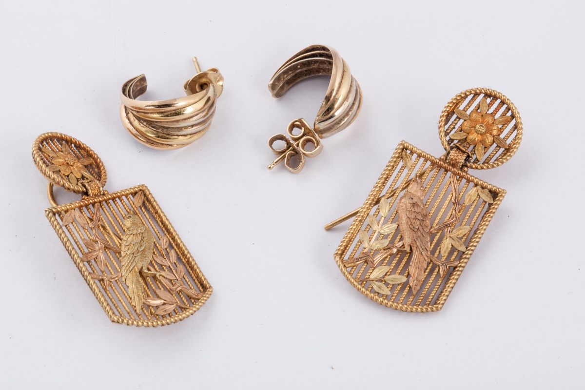 - BOUCLE d'OREILLES en or deux tons, figurant un oiseau dans des feuillages et fleurs, dans un encadrement de fines baguettes d'or. Long. 3,5 cm.