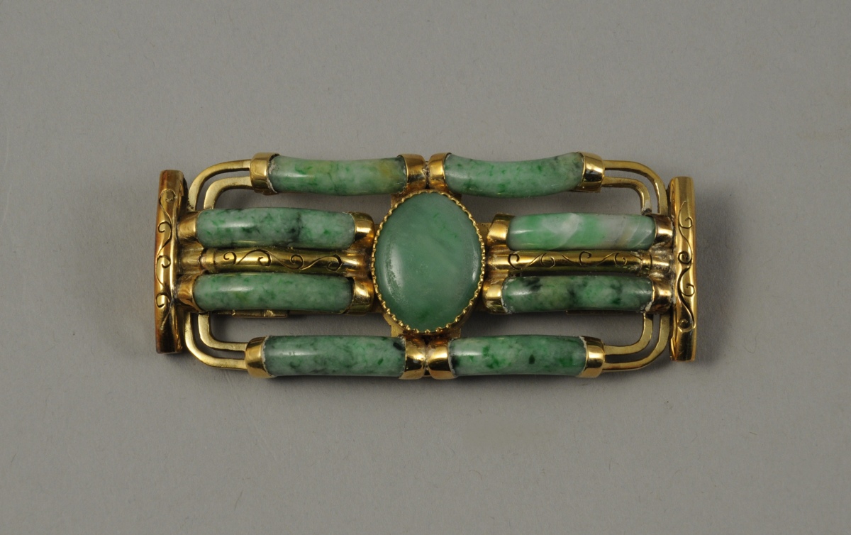 BROCHE en or jaune et jade à motifs de boucle géométrique : un médailon de jade encadré par six rubans de la même pierre. Travail mexicain de la fin du XIXe siècle.