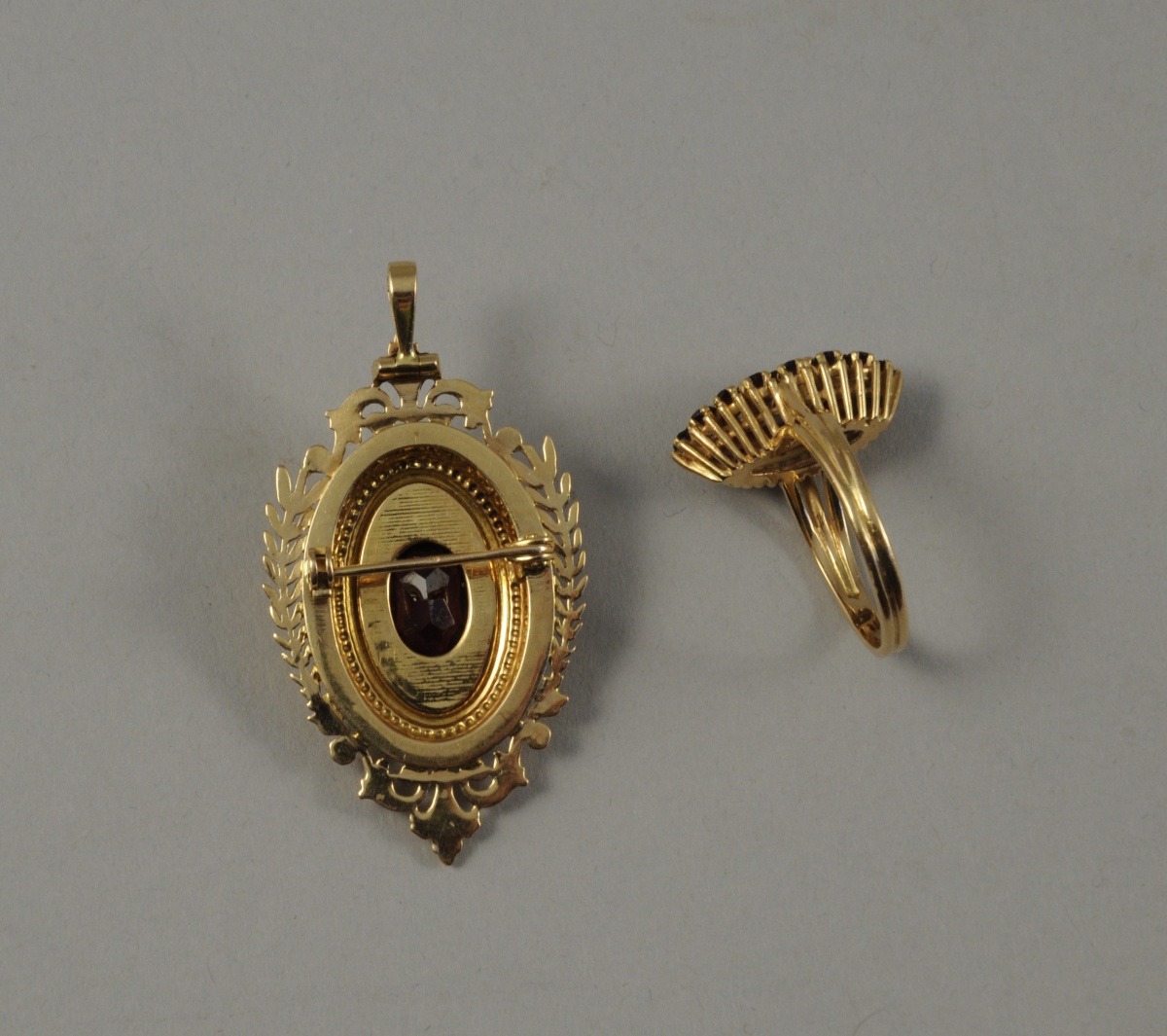 - PENDENTIF formant BROCHE en or jaune composé d'un grenat ovale central serti par un motif de guirlandes et de fleur-de-lys. Bélière escamotable. Haut. 4,5 cm. Poids brut : 7,6 g.