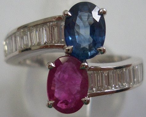 BAGUE TOI ET MOI en or blanc, ornée d'un saphir taille ovale de 1,10 carats environ et d'un rubis taille ovale 0,85 carat agrémentés de 21 diamants blancs taille baguette de 0,55 carat environ.