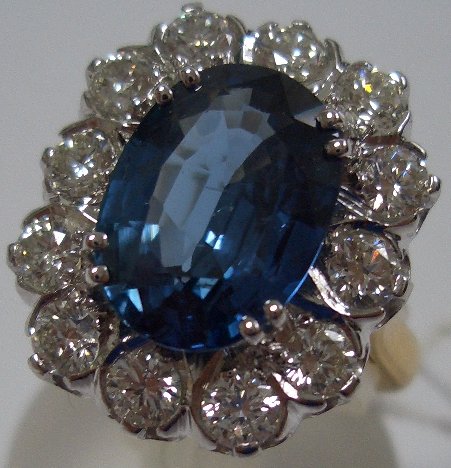 BAGUE COUSSIN de 2 ors, sertie d'un saphir taille ovale de 5,70 carats environ dans un entourage de 12 diamants blancs taille moderne de 1,60 carats.