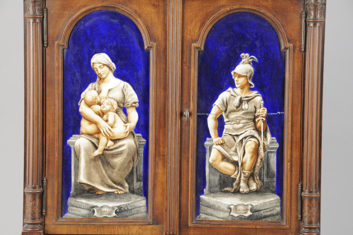 ARMOIRETTE-VITRINE en bois naturel de forme rectangulaire, à demi-colonne, fronton et base architecturés. Initiales JB. Elle ouvre à une double porte ornée de 2 plaques émaillées bleu représenant la "Charité" et le "Courage" en grisaille. Signées C VANDIER.