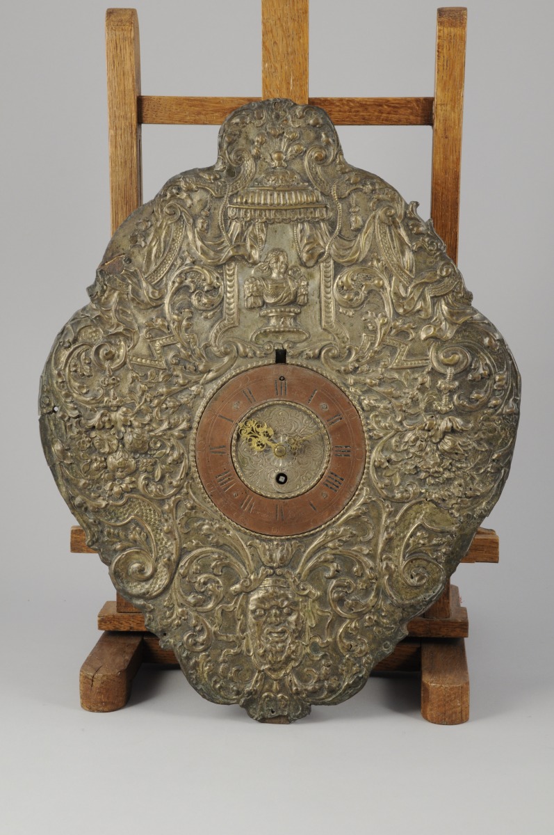 PENDULE de forme chantournée en métal repoussé. Elle figure sous un dais le buste d'un empereur romain en armure et reçoit un riche décor de volutes feuillagées, ferronneries, bouquets de fleurs et fruits et masque de faune. Le cadran de forme ronde en cuivre indique les heures en chiffres romains et les minutes en chiffres arabes. Il est signé "Ios Antoni Schoner Augustae".
