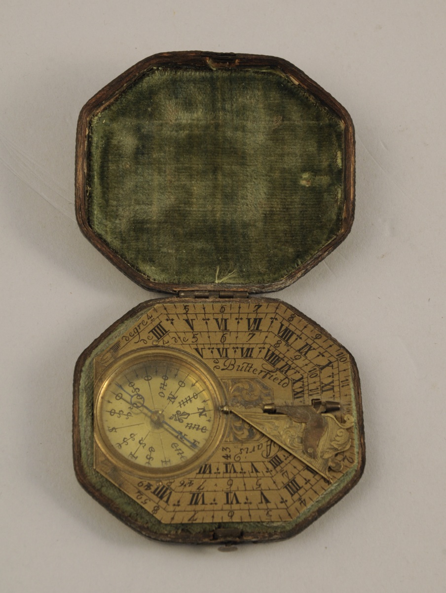 CADRAN SOLAIRE horizontal BUTTERFIELD en laiton. Platine octogonale comportant une boussole et gravée de quatre échelles horaires en chiffres arabes et romains alternés, dans laquelle se trouve le gnomon rabattable à l'oiseau réglable. Au dos figurent les latitudes des principales villes françaises et européennes. Signé "Butterfield à Paris". Dans un étui de chagrin noir doublé de velours vert.