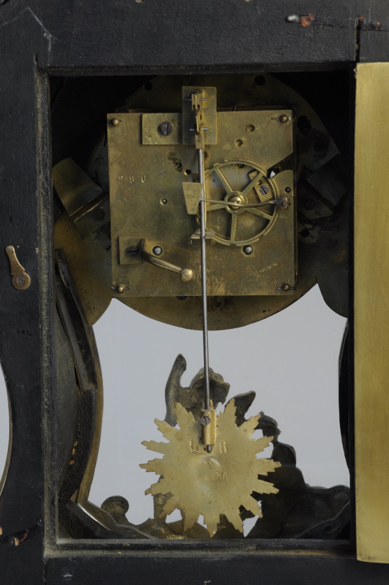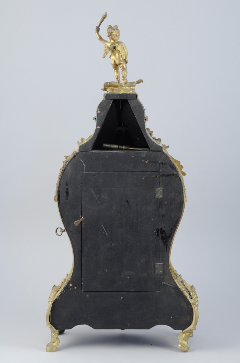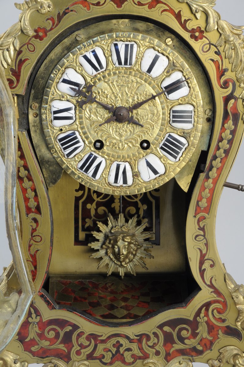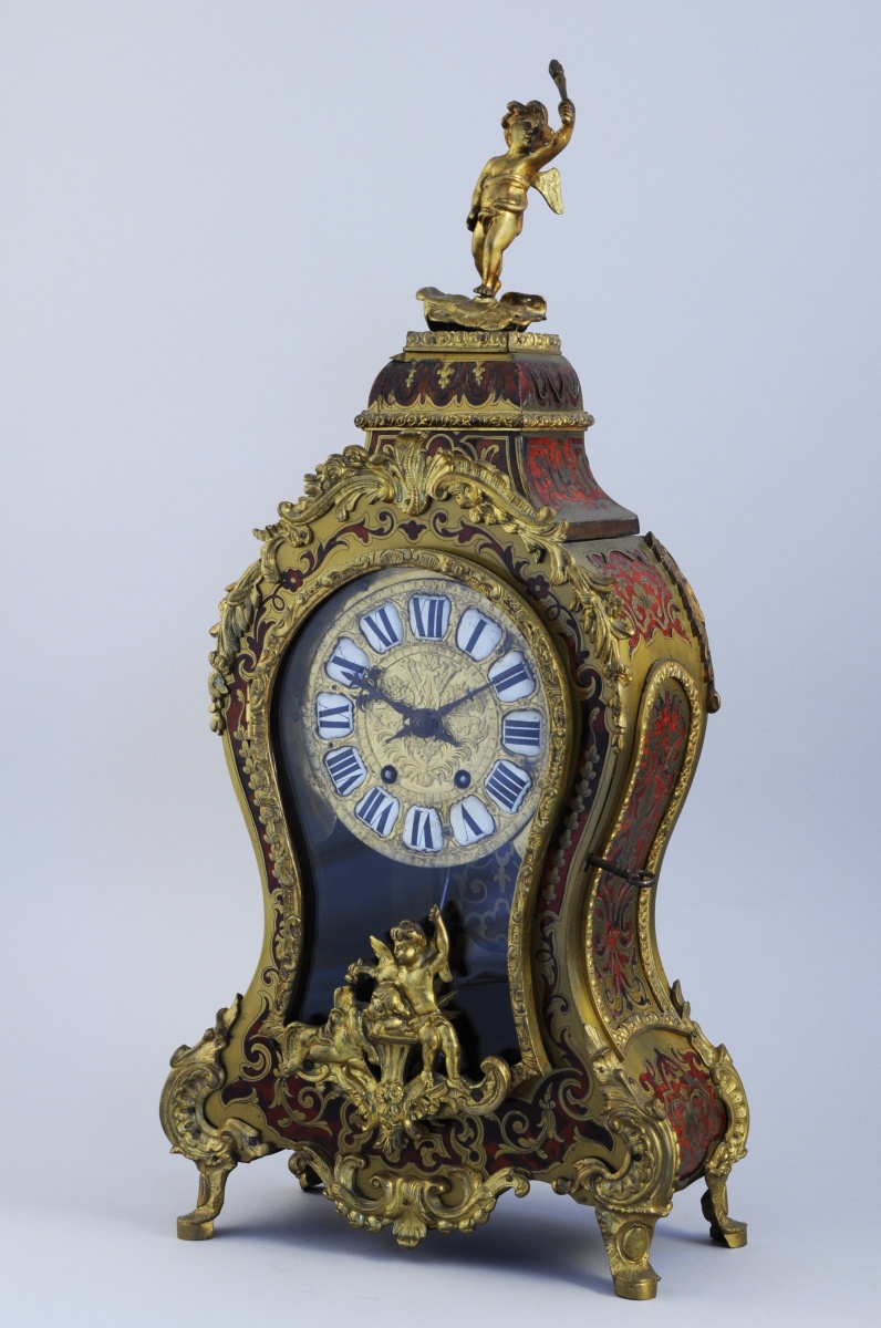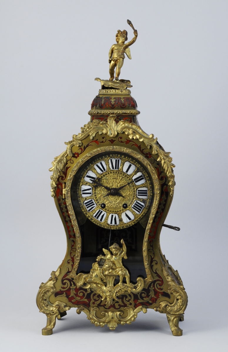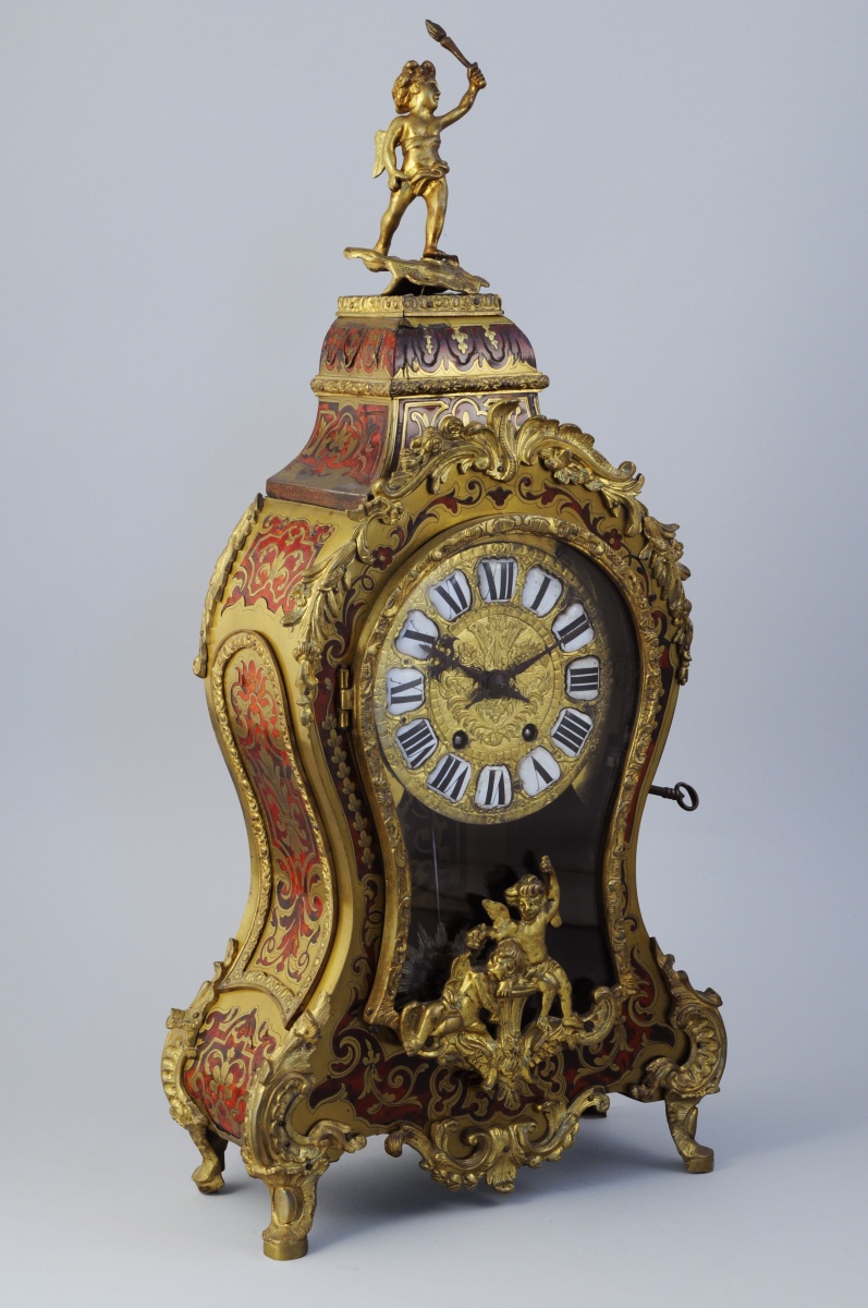 CARTEL de forme violonnée en marqueterie dite Boulle en partie de laiton sur fond d'écaille teintée rouge. Riche ornementation de bronzes ciselés et dorés tels le dieu Cupidon brandissant le flambeau de l'amour à l'amortissement, feuilles d'acanthe stylisées, fleurs, volutes et rinceaux. Façade ornée d'une allégorie figurant deux amours, dont l'un endormi, accompagnés d'une chouette. Le cadran présente douze cartouches émaillés blanc indiquant les heures en chiffres romains. Ils s'inscrivent dans un disque en bronze doré à décor de paniers fleuris et trophée d'instruments de musique.