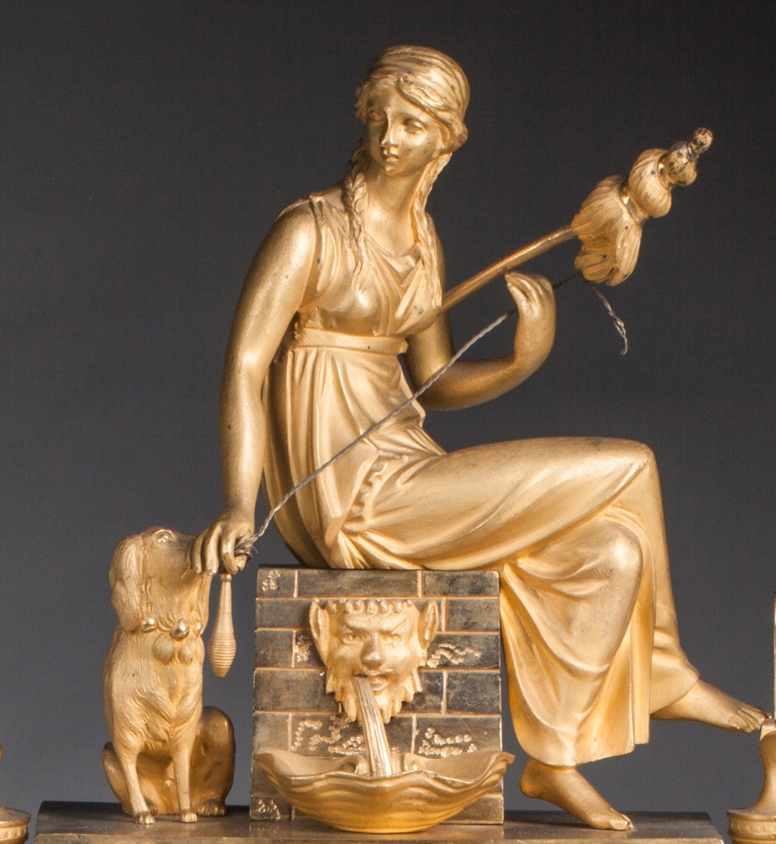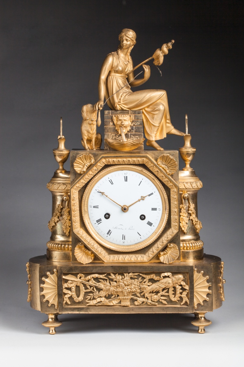 PENDULE À LA PARQUE en bronze ciselé et doré figurant une Parque filant assise sur une fontaine au masque de faune et accompagnée d'un chien. Le cadran s'inscrit dans une caisse rectangulaire, il est souligné d'un entourage octogonal orné d'une frise de feuilles d'acanthe et de quatre coquilles en écoinçons. Sur les côtés, deux demi-colonnes ornées de godrons, guirlandes feuillagées et feuilles d'acanthe. Elles sont sommées de deux aiguières. La base rectangulaire à côtés cintrés et ressaut central