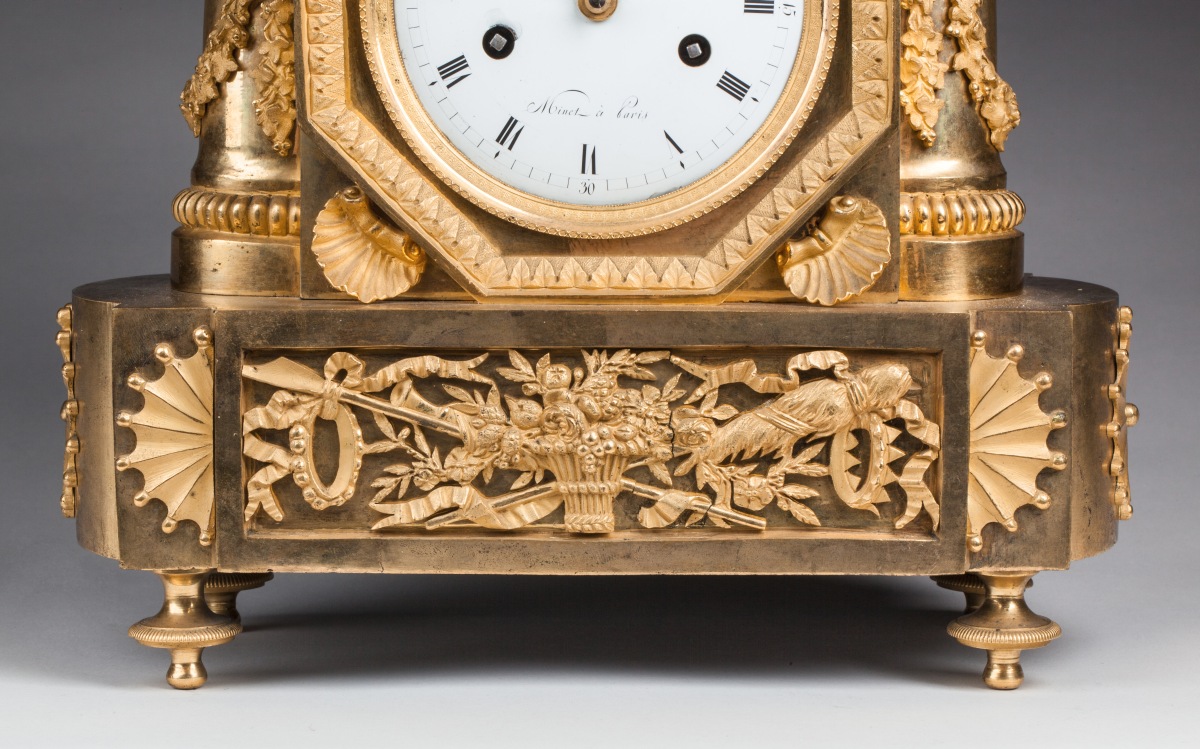 Le cadran émaillé blanc, indiquant les heures en chiffres romains et les quarts en chiffres arabes. Il est signé "Minet à Paris".