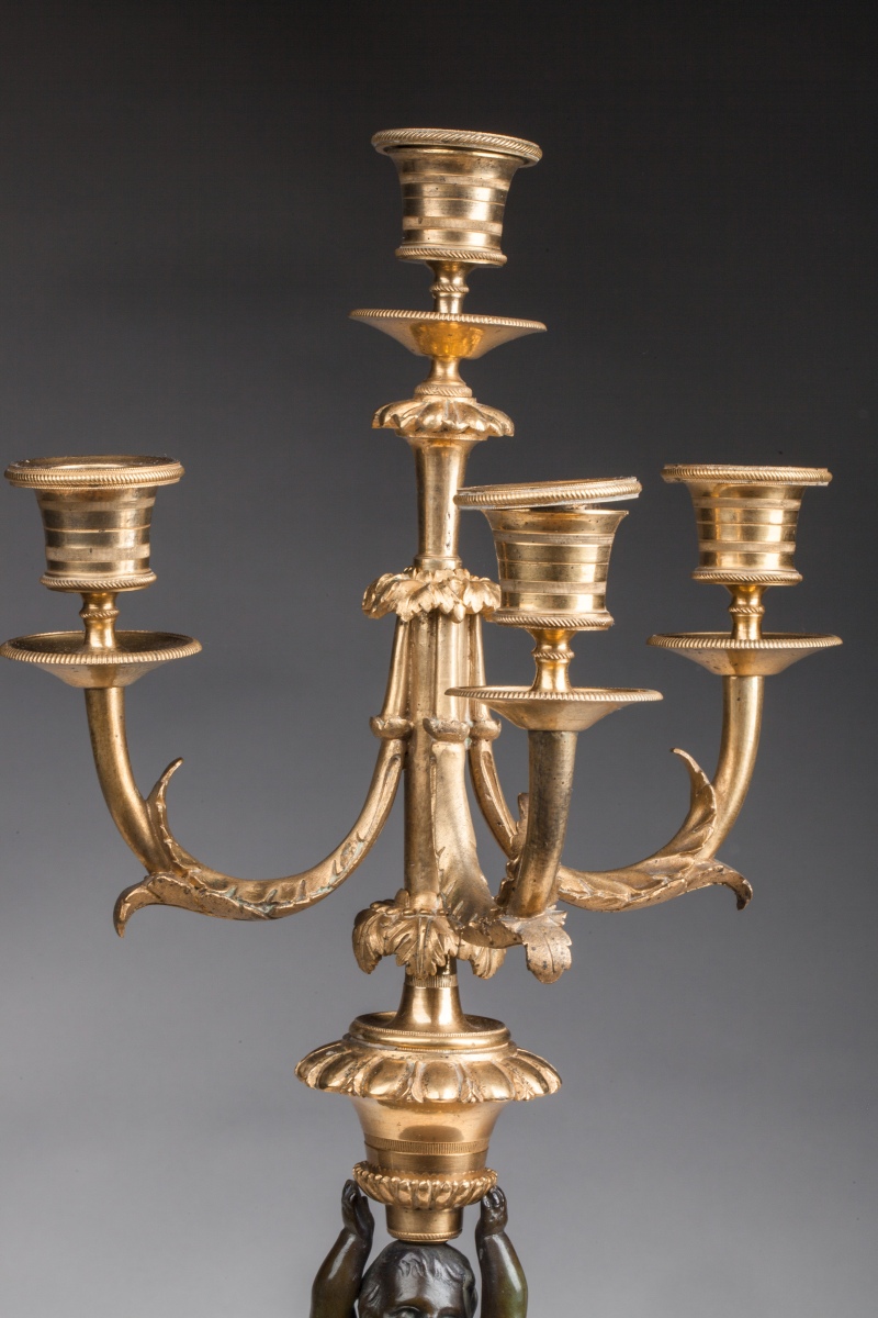 Paire de CANDÉLABRES à quatre lumières en bronze doré et bronze patiné. Bras de lumière adoptant la forme de rinceaux feuillagés. Ils reposent sur une toupie ornée de feuilles d'acanthe et godrons. Fûts figurés par un putto. Base cylindrique à décor appliqué de deux putti jouant avec un oiseau, d'une frise de câble et d'une frise d'oves et dards. L'ensemble repose sur une base carrée.