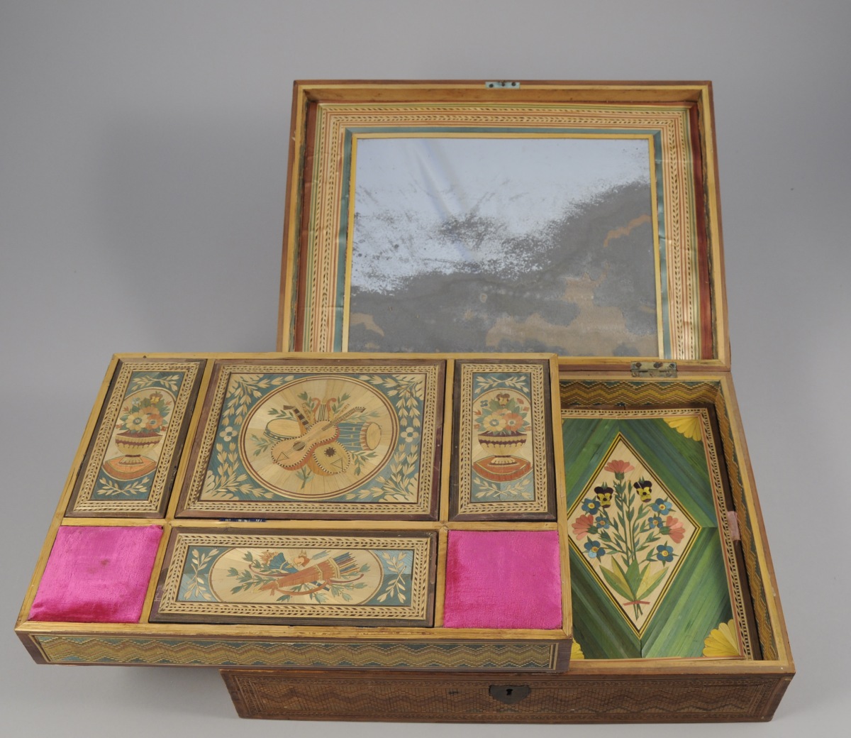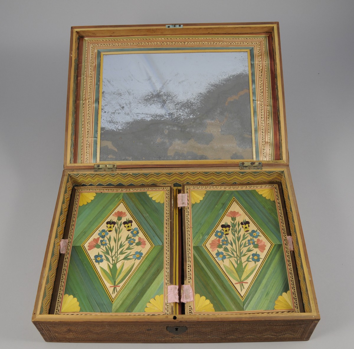 BOÎTE à OUVRAGES en marqueterie de paille. Le couvercle, foncé à l'intérieur d'un miroir, découvre un intérieur séparé, en partie inférieure, en deux compartiments, et comportant, en partie supérieure, un casier amovible. Ce dernier comporte deux coussins de brodeuse et quatre compartiments. Sur le couvercle, protégé par une vitre, scène de port agrémentée d'un château et de bateaux sur lesquels flotte le drapeau tricolore, et animée d'un jeune couple se tenant par le bras. L'ensemble est encadré de tiges entrelacées et de fleurs.À l'intérieur, décor d'un trophée de musique, de vases fleuris et des attributs de l'amour : carquois de flèches, flambeau et deux curs transpercés par la même flèche. Côtés marquetés de chevrons. Entrée de serrure en forme d'écusson.