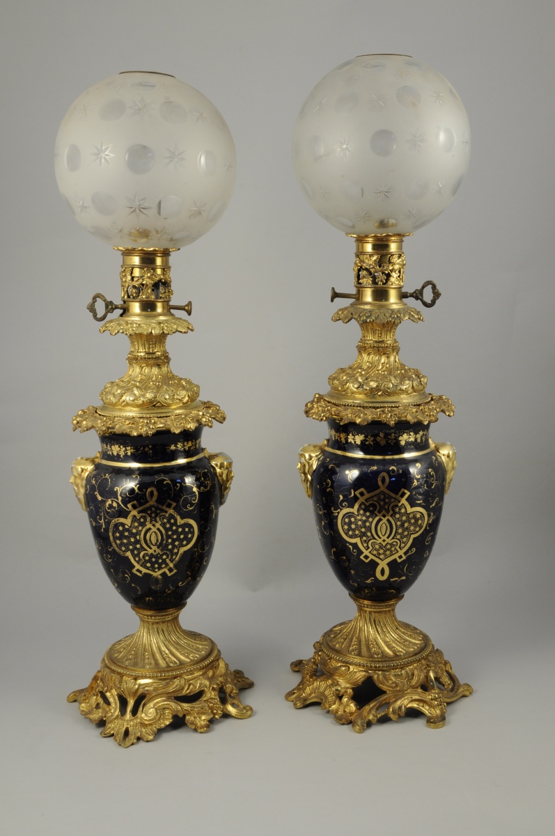 PAIRE DE LAMPES à PÉTROLE en bronze doré, porcelaine et verres. En forme de vase monté. Porcelaine à médaillon représentant des scènes bucoliques de jeunes filles et de chiens. Fond bleu royal à dorure de guirlandes de fleurs et feuilles d'acanthe stylisées. Encadré de têtes de satyres dorés en demi relief. Ornementation de bronzes tels que : feuilles d'acanthe ajourées, rais de perles et canaux torsadés à la base. Guirlande feuillagée, canaux rudentés et torsadés, fruits et fleurs supportant le porte-mèche ajouré. Verres boules givré à motifs de besants et étoiles taillées.