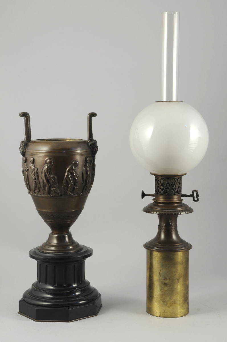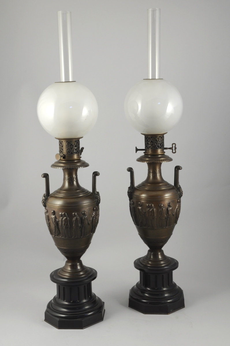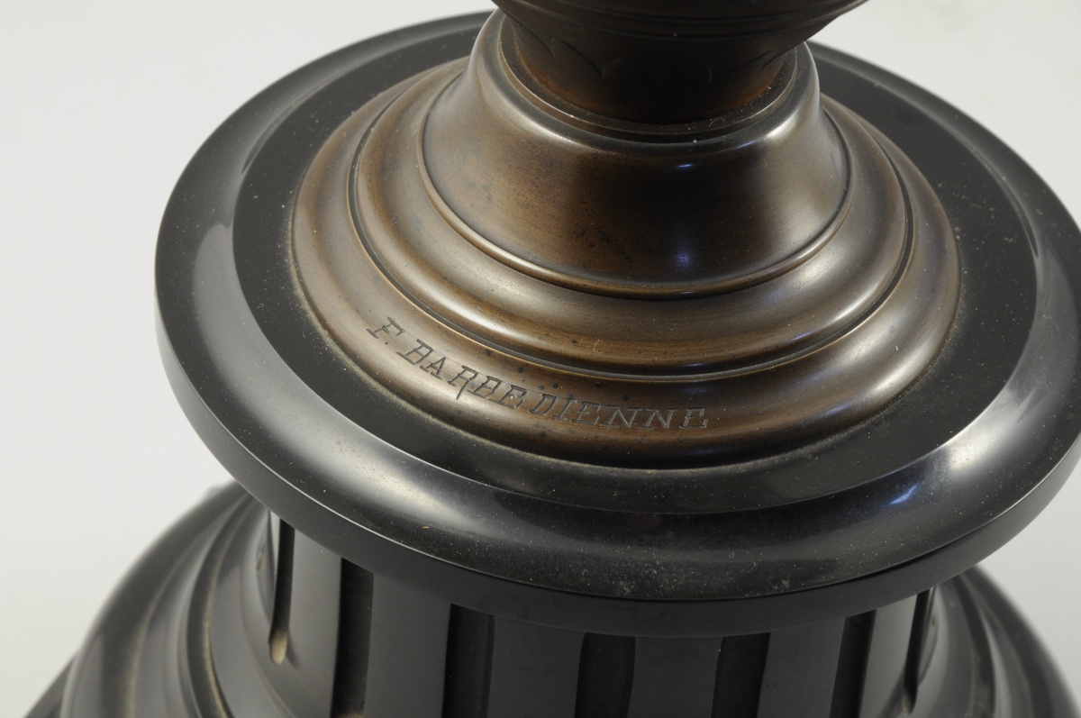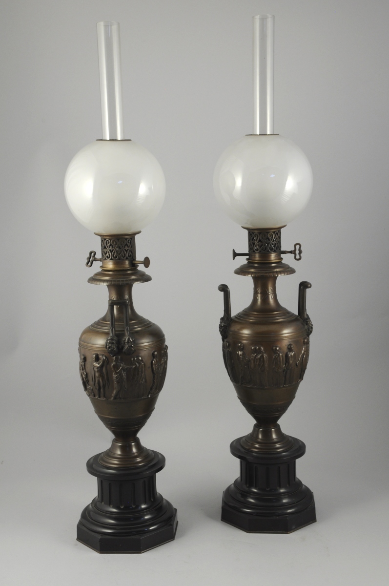 PAIRE DE LAMPES à PÉTROLE en bronze patiné et marbre noir en forme de vase antique à deux anses ornées de mascarons. Frise de personnages vêtus à l'antique. Reposant sur une colonne cannelée, base à tores. Verres boules givrés et cheminée en verre translucide. Signées BARBEDIENNE, attribuées à Désiré ATTARGE (1820-1878).