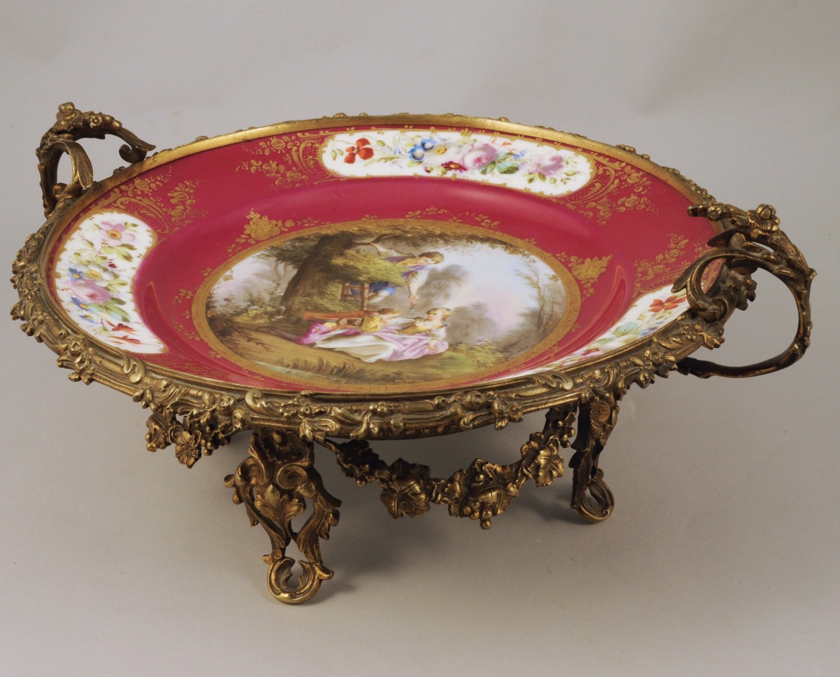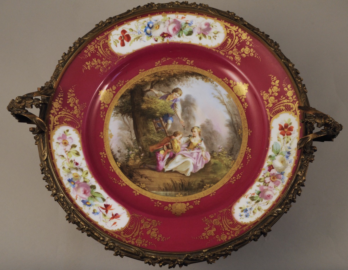 PLAT en porcelaine polychrome montée. Le plat peint en son centre d'une scène amoureuse dans le goût de Watteau, l'aile lie de vin avec trois cartouches fleuris. Marque apocryphe de la manufacture de Sèvres au verso. Monture à quatre pieds en bronze feuillagé.
