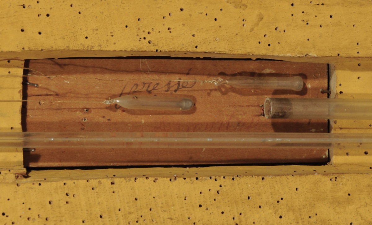 BAROMÈTRE en bois sculpté, stuqué et doré, coiffé d'un bouquet et de guirlandes de fleurs. Cadran de forme ovale peint à fond blanc avec l'inscription " AU THELESCOPE. QUAY DE L'HORLOGE ", au-dessus d'un thermomètre Réaumur. Culot feuillagé. Baromètre à mercure.