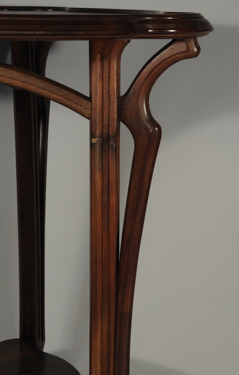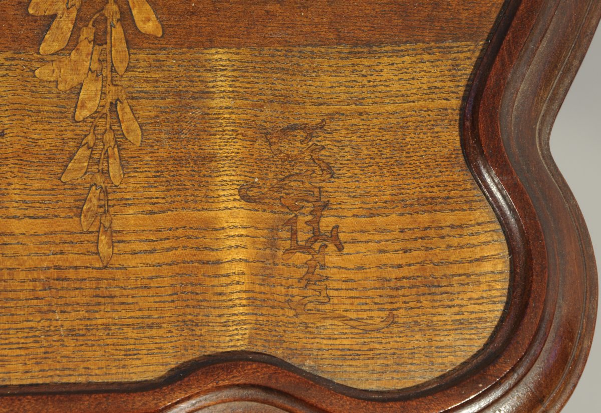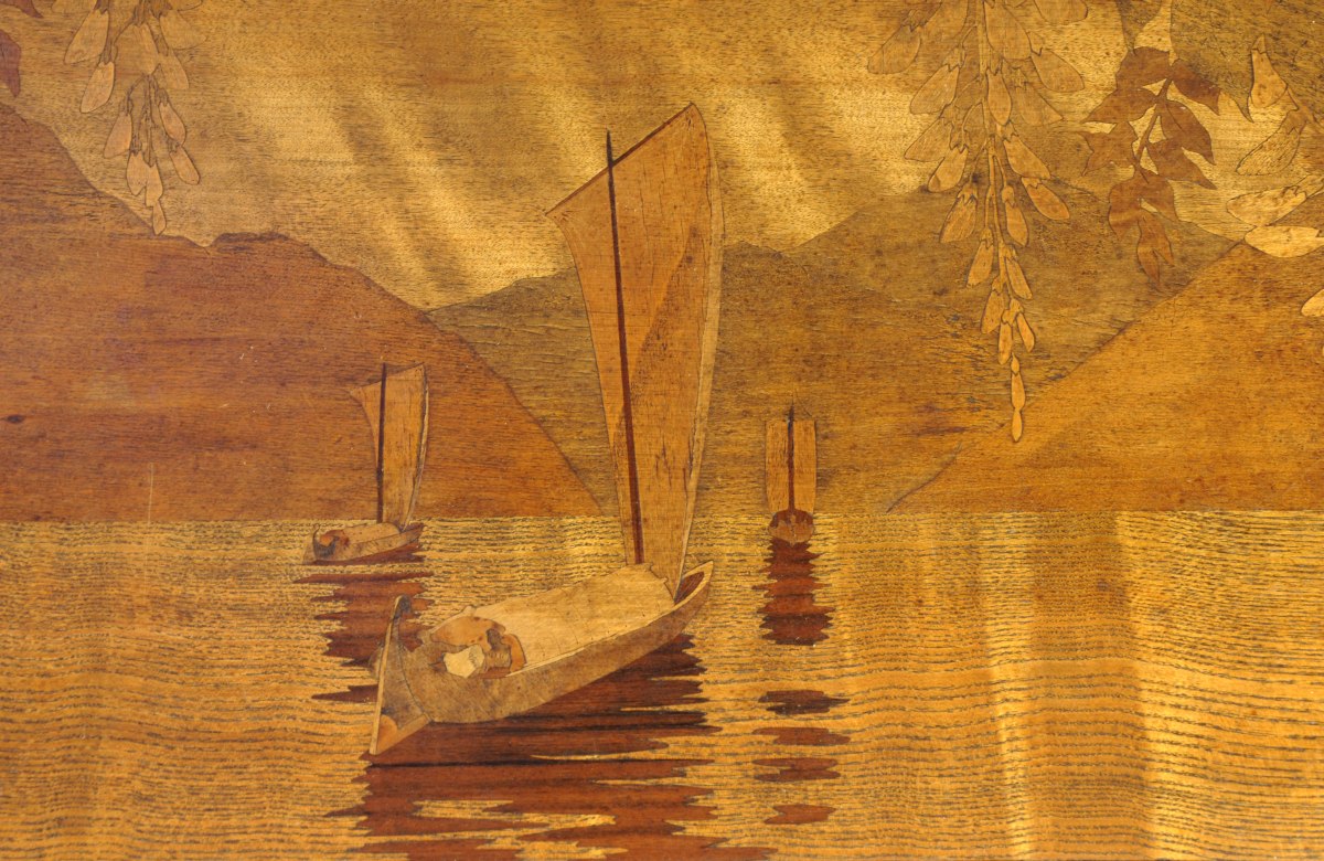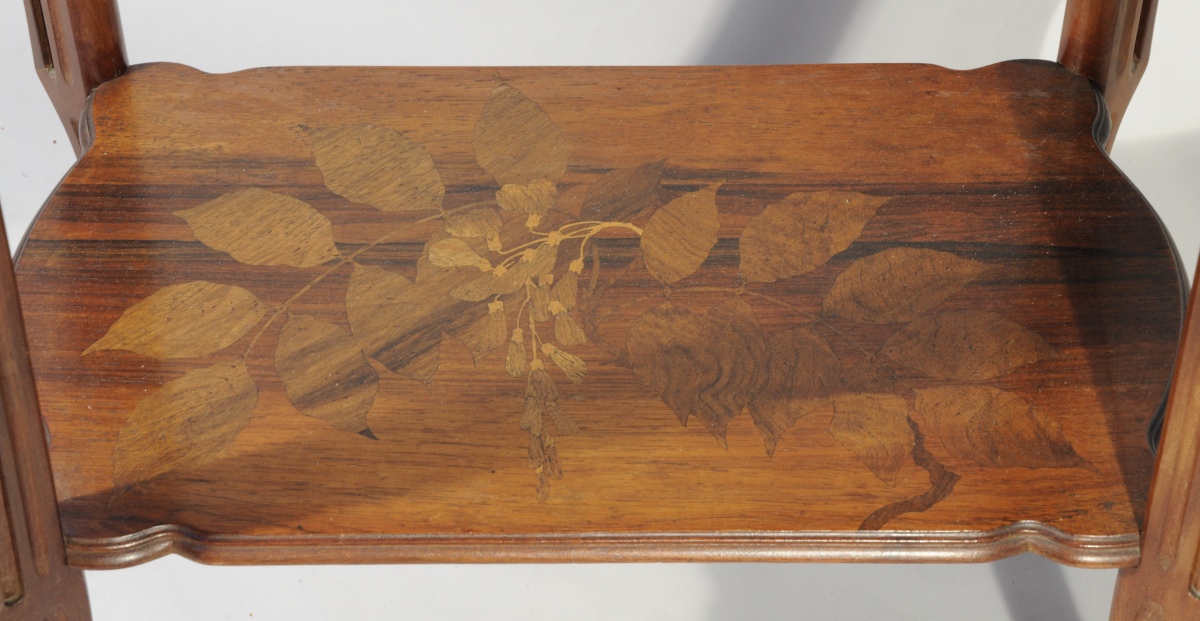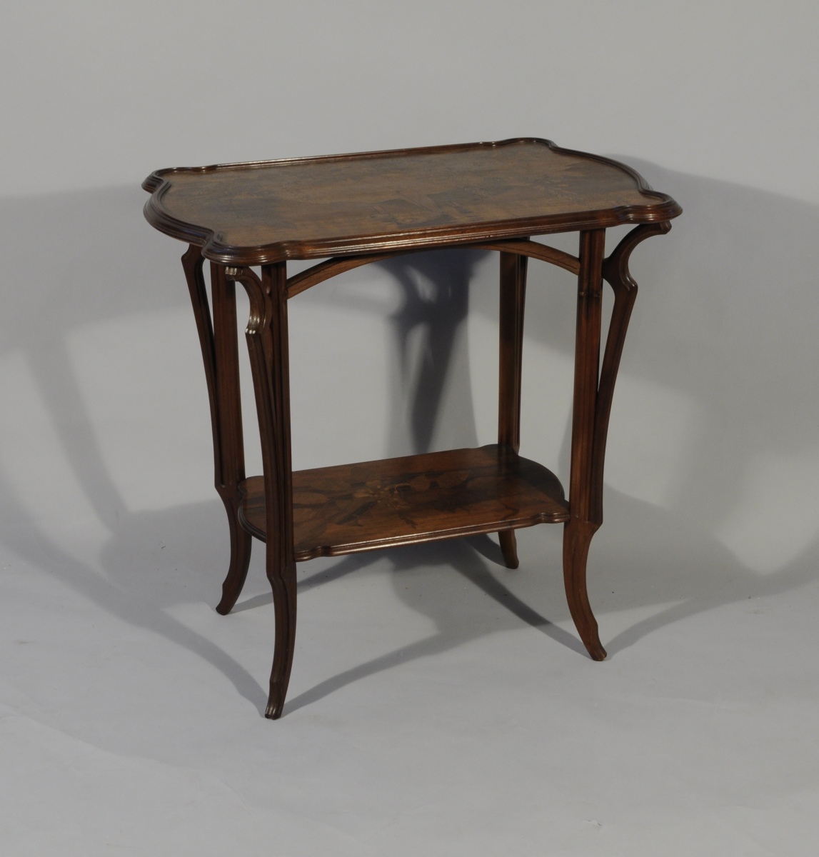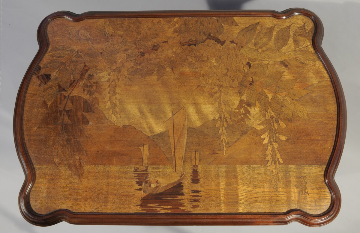 TABLE À THÉ en noyer et placage de forme mouvementée à deux plateaux reposant sur quatre pieds nervurés et ajourés de forme végétale. Le plateau supérieur marqueté d'une scène de navires dans un entourage de glycine, le plateau inférieur marqueté d'une branche de glycine. Signature nouille.