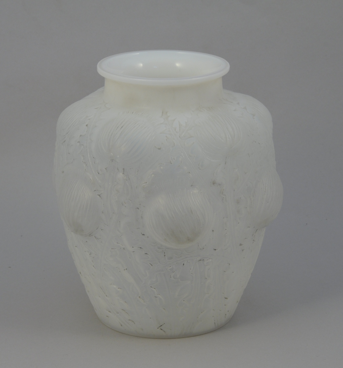 Vase en verre blanc soufflé-moulé patiné opalescent signé à la pointe "R. Lalique France".