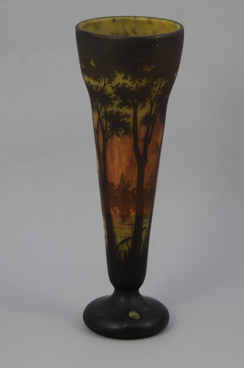 DAUM. VASE tulipe à piedouche, en verre dégagé à l'acide, à décor sylvestre en bordure de lac.