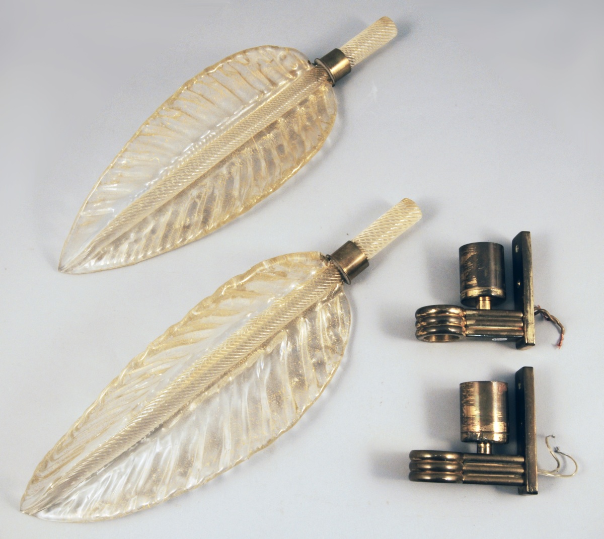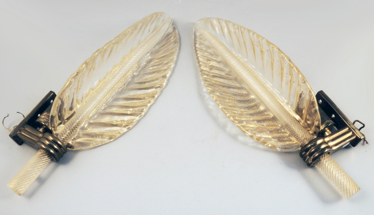 PAIRE D'APPLIQUES en verre soufflé (Murano ?) à rehauts dorés en forme de plume. Support en bronze doré cannelé.