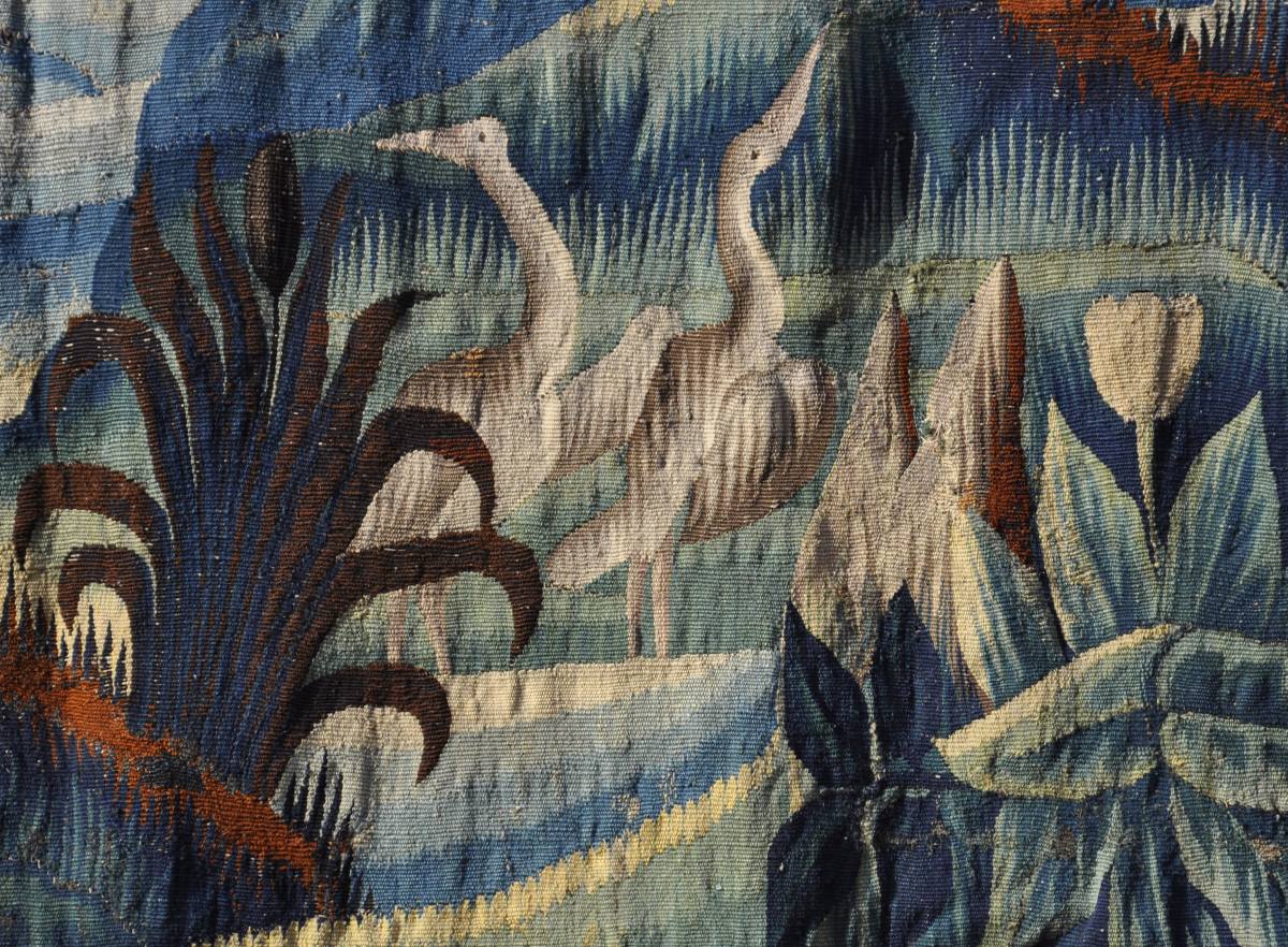 AUBUSSON. TAPISSERIE en laine figurant une verdure au couple d'échassiers....