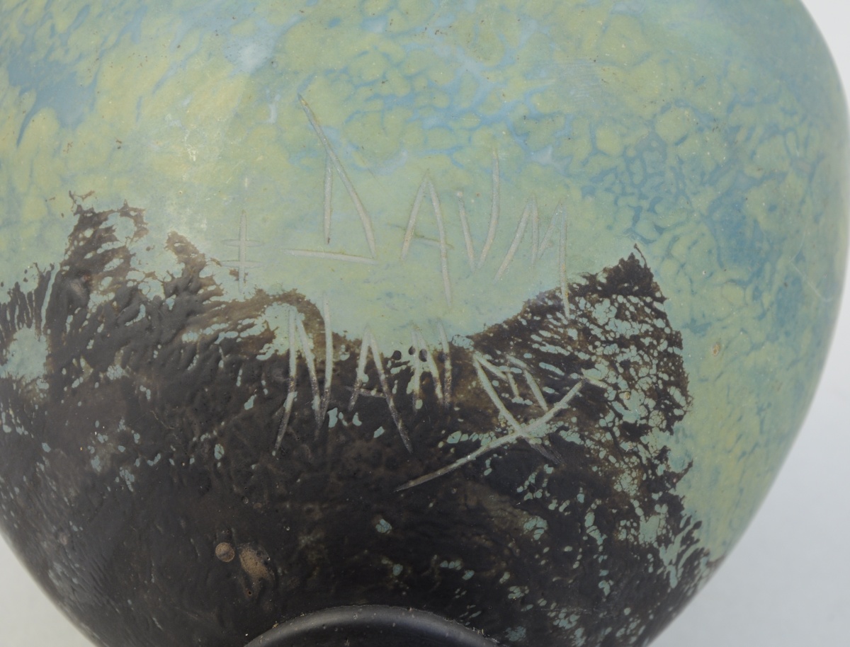 DAUM. Vase coupe évasé de couleur vert marbré sur piédouche de couleur cendre.