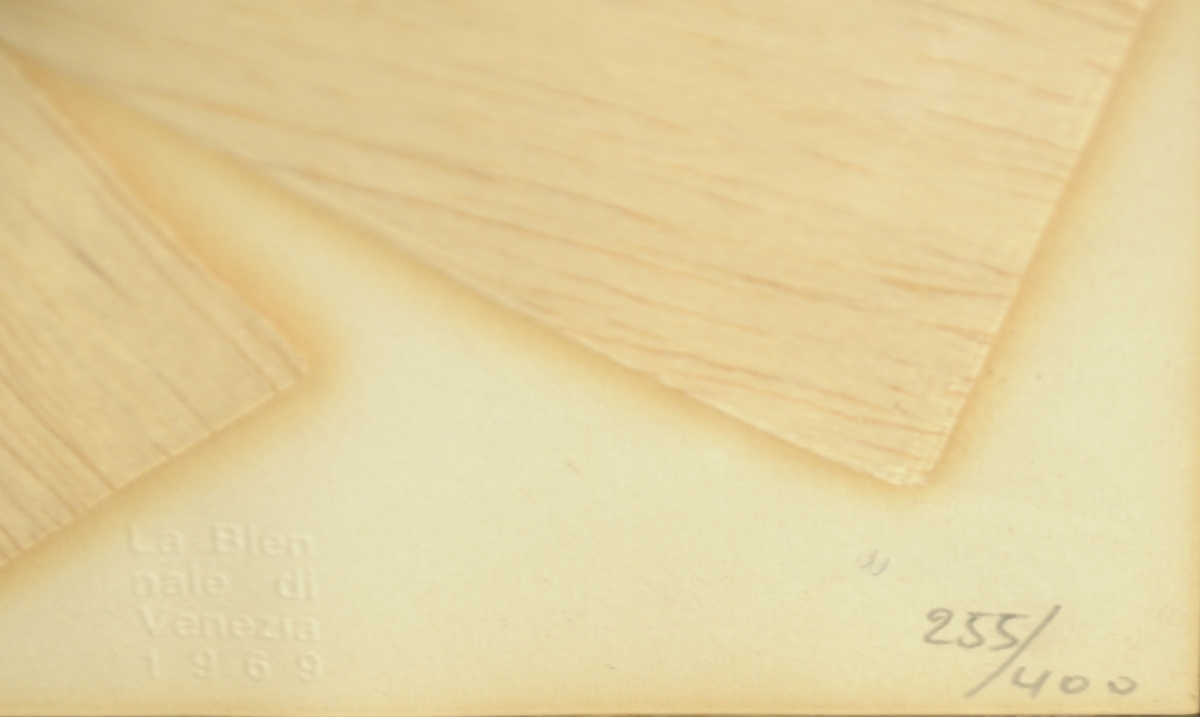 Bois découpé, signé en bas à gauche et justifié 255/400 en bas à droite. Cachet à sec sur le papier "La Biennale di Venezia 1969".