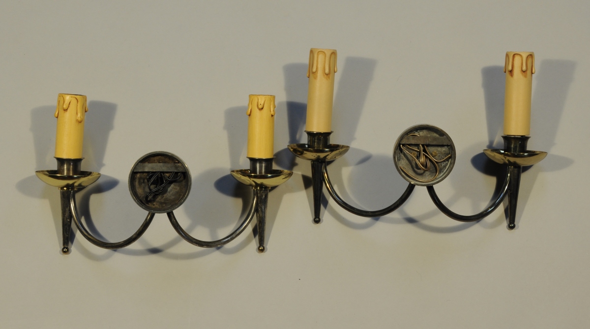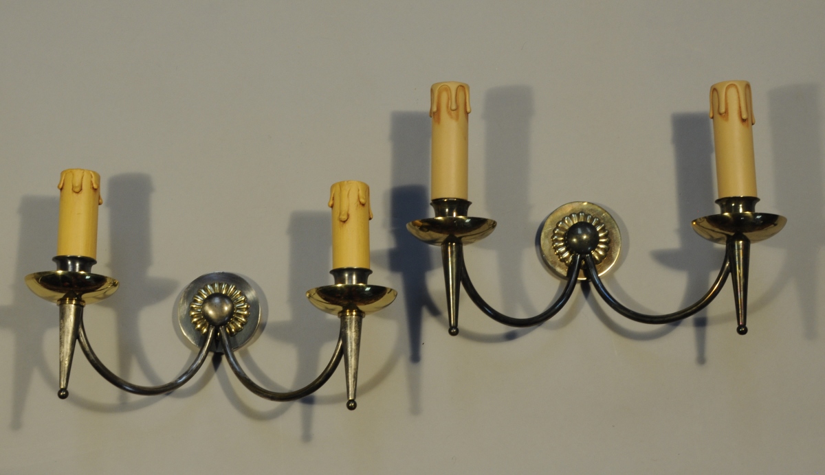 Maison BAGUES. PAIRE D'APPLIQUES à deux lumières en métal patiné et bronze doré dite "canons de fusil".