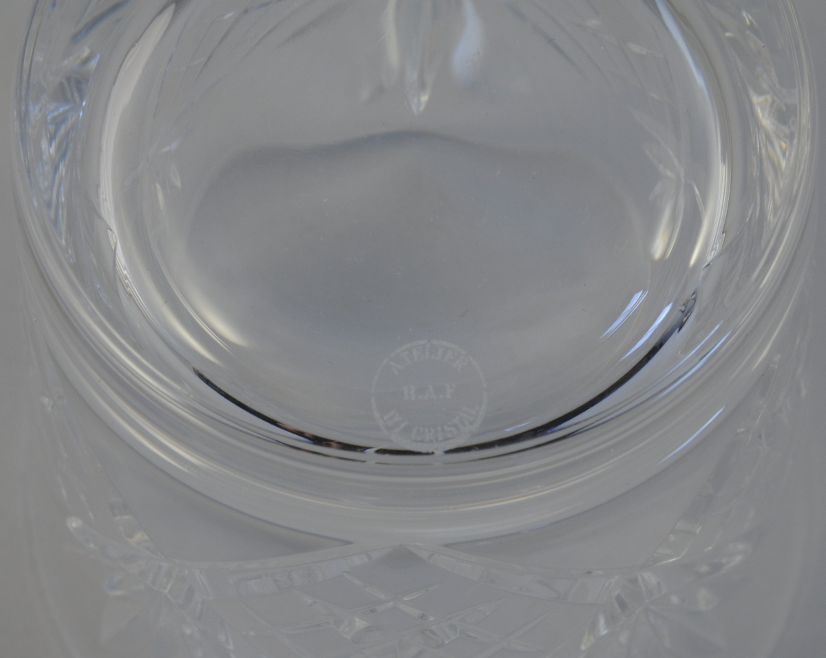 SERVICE en cristal de 25 pièces à décor de pointes de diamants et palmes comprenant six verres à vin, six verres à eau, cinq flûtes à Champagne, six verres à whisky, un seau à Champagne et une carafe. Marque "Atelier / H.A.F / MJ Cristal".