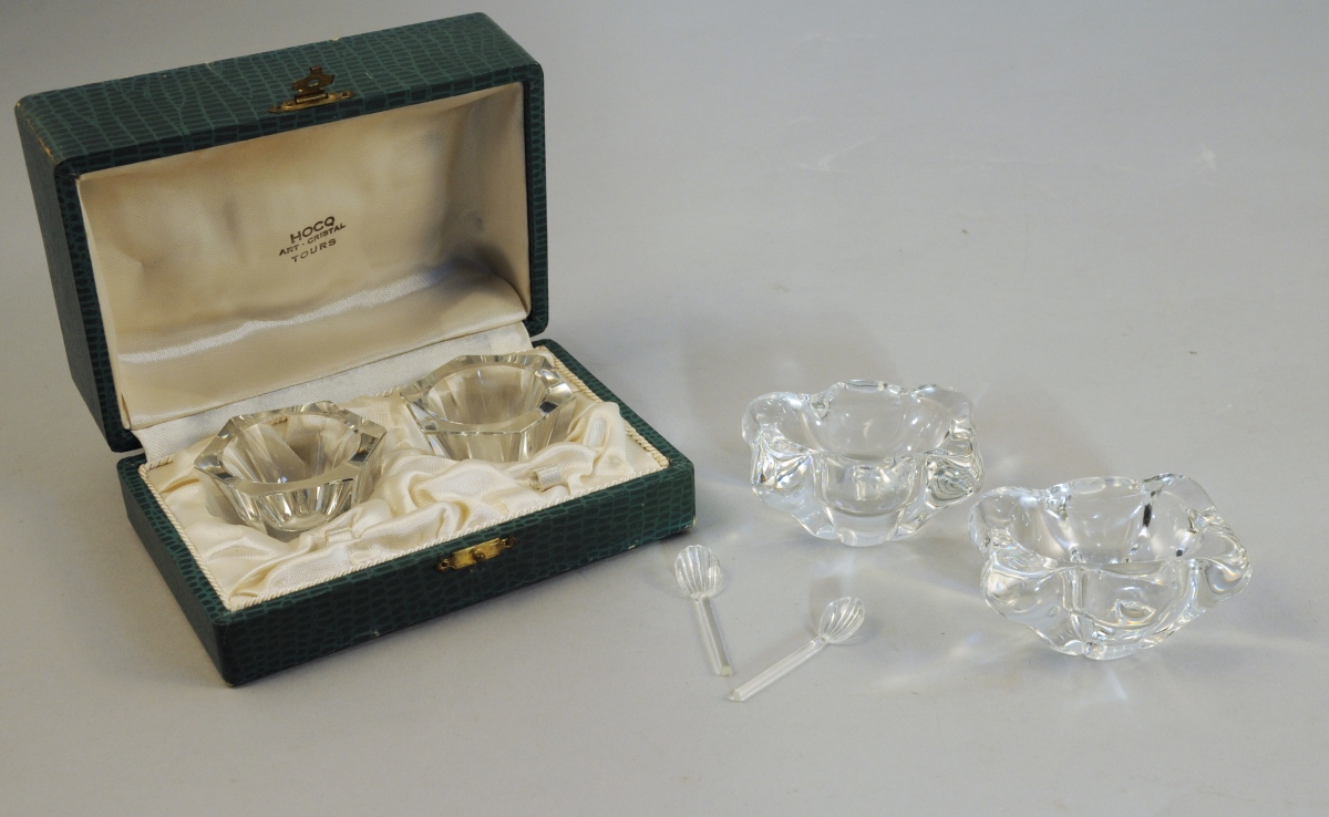 2 paires de SALIÈRES en cristal taillé. Une à pans coupés par BACCARAT. L'autre à bordure chantournée et cuillères en cristal.