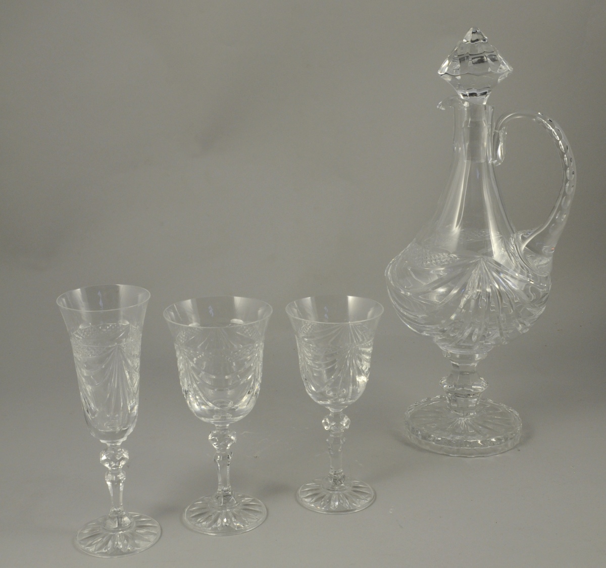 SERVICE de VERRES en cristal taillé de 19 pièces. Comprenant six verres à vin, six flûtes à champagne, six verres à eau et une carafe. Décor taillé à croisillons. XXè. (coffrets).