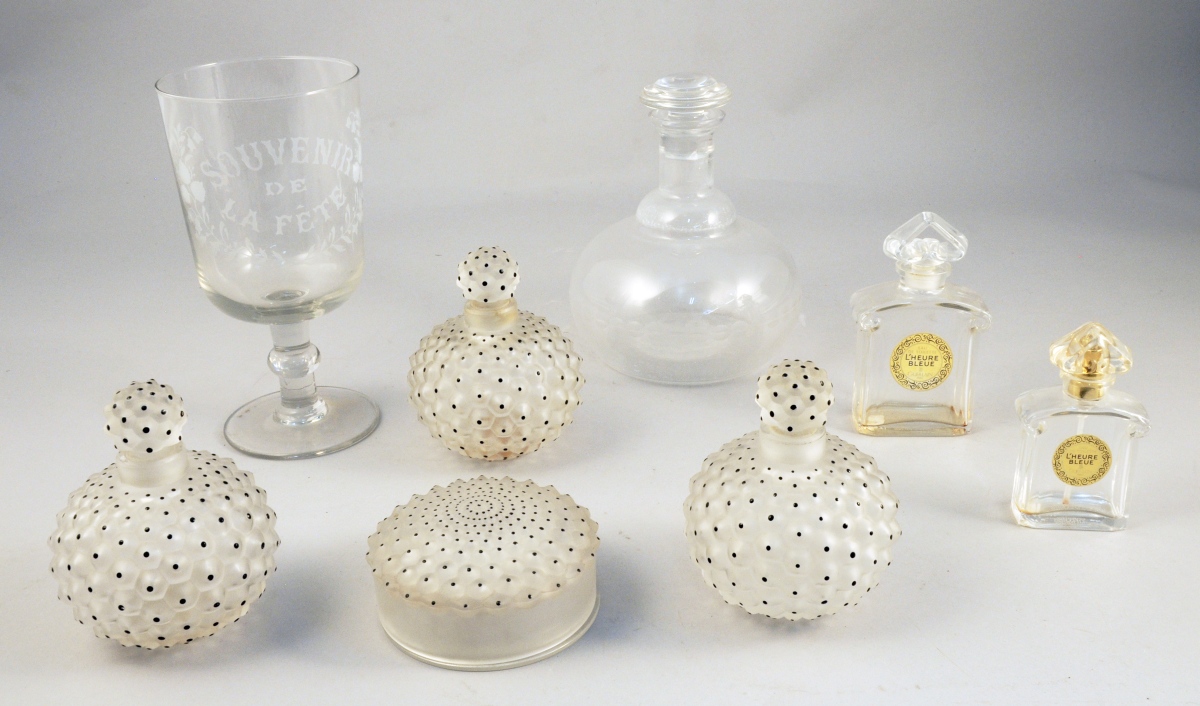 JOINT : 2 FLACONS à parfum Guerlain " l'Heure Bleue ", une CARAFE, un grand VERRE sur pied insculpé " Souvenir de la Fête ". Verre Haut. 21 cm.